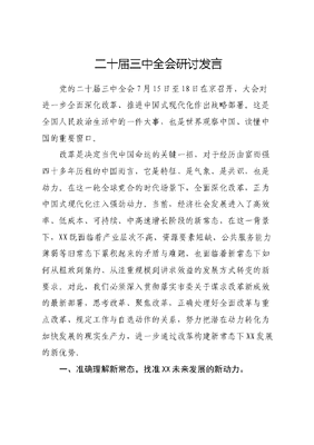 二十届三中全会研讨发言党的二十届三中全会7月15日至18日在京召开,大会对进一步全面深化改革、推进中国式现代化作出战略部署。这是全国人民政治生活中的一件大事,也是世界观察中国、读懂中国的重要窗口。改革是决定当代中国命运的关键一招,对于经历由富而强四十多年历程的中国而言,它是特征、是气象、是共识,也是动力。在这一轮全球竞合的时代场景下,全面深化改革,正为中国式现代化注入强劲动力。当前,经济社会发展进入了高效率、低成本、可持续、中高速增长阶段的新常态,在这一背景下,XX既面临着产业层次不高、资源要素短缺、公共服务能力薄弱等旧常态下累积起来的矛盾与难题,也面临着新常态下如何从粗放到集约、从注重规模到讲求效益的发展方式转变的新要求。对此,我们必须深入贯彻落实市委关于谋求改革新成效的最新部署,思考改革、聚焦改革,正确处理好全面改革与重点改革、规定工作与自选动作的关系,努力把潜在动力转化为加快发展的现实生产力,进一步通过改革构建新常态下XX发展的新优势。一、准确理解新常态,找准XX未来发展的新动力。新常态是相对于不同以往的、相对稳定的状态,是一种趋势性、不可逆转的发展状态,意味着中国经济已进入一个与过去40多年高速增长期不同的新阶段。从宏观形势来看,新常态下无论是经济增长的动力机制、收入结构还是需求结构都发生了明显变化,一产、二产占比逐渐降低,三产比重持续上升,企业在国民财富中占比降低、个人收