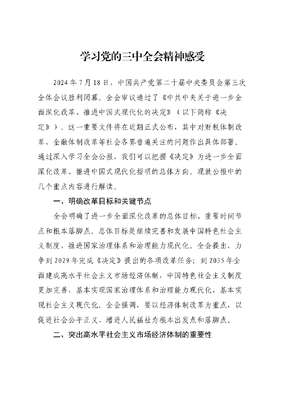 学习党的三中全会精神感受2024年7月18日,中国共产党第二十届中央委员会第三次全体会议胜利闭幕。全会审议通过了《中共中央关于进一步全面深化改革、推进中国式现代化的决定》(以下简称《决定》)。这一重要文件将在近期正式公布,其中对财税体制改革、金融体制改革等社会各界普遍关注的问题作出具体部署。通过深入学习全会公报,我们可以把握《决定》为进一步全面深化改革、推进中国式现代化指明的总体方向。现就公报中的几个重点内容进行解读。一、明确改革目标和关键节点全会明确了进一步全面深化改革的总体目标、重要时间节点和根本落脚点。总体目标是继续完善和发展中国特色社会主义制度,推进国家治理体系和治理能力现代化。全会提出,力争到2029年完成《决定》提出的各项改革任务;到2035年全面建成高水平社会主义市场经济体制,中国特色社会主义制度更加完善,基本实现国家治理体系和治理能力现代化,基本实现社会主义现代化。全会强调,要以经济体制改革为重点,以促进社会公平正义、增进人民福祉为根本出发点和落脚点。二、突出高水平社会主义市场经济体制的重要性全会指出,高水平社会主义市场经济体制是中国式现代化的重要制度保障。要充分发挥市场在资源配置中的决定性作用,更好发挥政府作用。一方面,要进一步激发市场活力,实现资源配置效率最优化和效益最大化;另一方面,要坚持放管结合、优化服务,通过科学有效的宏观调控和政府治理,更好维护市场秩序、
