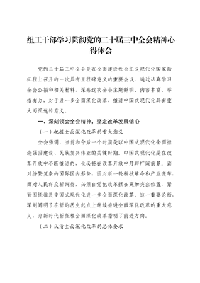组工干部学习贯彻党的二十届三中全会精神心得体会党的二十届三中全会是在全面建设社会主义现代化国家新征程上召开的一次具有里程碑意义的重要会议。通过认真学习全会公报和相关材料,深感这次全会主题鲜明、内容丰富、举措有力,对于进一步全面深化改革、推进中国式现代化具有重大而深远的意义。一、深刻领会全会精神,坚定改革发展信心(一)把握全面深化改革的重大意义全会强调,当前和今后一个时期是以中国式现代化全面推进强国建设、民族复兴伟业的关键时期。中国式现代化是在改革开放中不断推进的,也必将在改革开放中开辟广阔前景。面对纷繁复杂的国际国内形势,面对新一轮科技革命和产业变革,面对人民群众新期待,必须自觉把改革摆在更加突出位置,紧紧围绕推进中国式现代化进一步全面深化改革。这一重要论断,深刻阐明了在新的历史起点上继续推进全面深化改革的重大意义,为新时代新征程全面深化改革指明了前进方向。(二)认清全面深化改革的总体要求全会明确了进一步全面深化改革的总目标:继续完善和发展中国特色社会主义制度,推进国家治理体系和治理能力现代化。到二三五年,全面建成高水平社会主义市场经济体制,〇中国特色社会主义制度更加完善,基本实现国家治理体系和治理能力现代化,基本实现社会主义现代化,为到本世纪中叶全面建成社会主义现代化强国奠定坚实基础。这一总目标既与党的十八届三中全会提出的全面深化改革总目标一脉相承,又与党的XX大作出的战略部署相