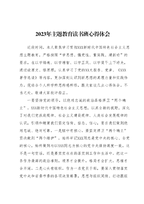 2023年主题教育读书班心得体会近段时间,本人聚焦学习贯彻XXX新时代中国特色社会主义思想主题教育,严格按照学思想、强党性、重实践、建新功的要求,在以学铸魂、以学增智、以学正风、以学促干上下功夫,通过读原文、悟原理,认真学习了党的XX大报告、党章、《XXX著作选读》等内容,更加深刻认识到新思想的真理力量和实践伟力。现结合个人所学所思所感所悟,跟大家谈几点心得体会。不当之处,敬请大家批评指正。一要坚持党的领导,以绝对忠诚的政治品格捍卫两个确立。XXX新时代中国特色社会主义思想,以其全新的视野,深化了对我们党执政规律、社会主义建设规律、人类社会发展规律的认识,引领和鞭策我们坚定信仰、信念、信心,要求我们做到绝对忠诚、绝对可靠。一是脑中有核心。要坚定捍卫两个确立坚决做到两个维护,始终牢记XXX同志是党中央的核心、全党的核心,始终做到与以XXX同志为核心的党中央保持高度一致。这不是一句空话,而是要实实在在的落实到工作和生活中。把这一条作为最高的政治准则,境界才会提升,格局才会扩大,思维才会开阔。二是心头有组织。作为一名党员干部,要深入贯彻落实党中央和省委市委的各项决策部署,思想与组织同频、行动跟组织一致。三是肩上有责任。我们每个人的工作都是单位事业发展的一部分,也是党的事业发展的一份子。每个人工作质量的高低工作成果的好坏,都直接或间接影响xx事业的发展。这要求我们必须锤炼工匠精神,以精益求精的要求融入工作每个环节,把每一项工作做精做实做优。二要坚持知行合一,以有力有效的工作质量保障发展大局。一分部署,九分落实。XXXXXX强调,如果不沉下心来抓落实,再好的目标,再好的蓝图,也只是镜中花、水中月。因此,我们必须坚定目标、踏实作风,发挥智慧和力量,推动工作的实施。首先,我们需要增强理解力。要充分理解和贯彻上级的意图和精神明确目标是什么、为什么要实现这个目标以及如何实现目标。在工作中,我们需要提高自己的战略思维和全局把握能力,提升理论素养和政策水平,以适应新时代的新目标和新使命。具体来说就是要围绕市委的决策部署,落实xxx建设年和xxxx规范化建设年的行动计划,提升xxxx的服务水平和xxx高质量发展的能力。其次,我们要提高执行力。在主题教育工作会议上,xxx书记多次强调要坚持问题导向,正视存在的问题并积极解决。在工作中,我们要秉持实事求是的态度,积极面对问题,采取切实有效的措施。我们将强化工作人员的履职尽责意识,不断开拓创新,把总要求体现在实际效果上。最后,我们要发挥创造力。在信息技术飞速发展的时代背景下,我们必须紧跟时代步伐,充分发挥xxx的作用。我们将聚焦于推动xx现代化改革,为统计创新提供坚实的支撑。通过利用先进的信息技术手段,我们有能力推动xxx现代化改革的进程,为未来的xxx工作打下坚实的基础。总之,只有通过深入理解和贯彻上级的意图精神、提高执行力和发挥创造力,我们才能更好地部署和落实工作,实现既定的目标。三要坚持反腐治乱,以敢于斗争的坚强意志推动党的建设。深入推进新时代党的建设新的伟大工程是XXX新时代中国特色社会主义思想的关键内容。面对精神懈怠、能力不足、脱离群众、消极腐败等一系列现实考验,我们必须修炼身躯,做到不碰高线、不触底线、不越红线。坚持以法为尊。尊重法治、敬畏法律,这是党员干部必须具备的基本素质。只有当我们的内心真正尊崇法治,才能做到行为遵守法律。我们要牢固树立法治观念,使工作依法运行、行为依法规范。其次,要坚持以案为鉴。回顾近年来所通报的一系列违纪违法案件,都有一个共同点,那就是自我警醒不够、要求不严、约束不力。从根本上看,还是思想出了问题失去了原则和敬畏。因此,我们需要了解问题的底线在哪里、要求有哪些、危害有多大,从身边的人和事中吸取教训,使自己知敬畏、存戒惧、守底线。最后,我们要坚持以廉为本。公心是关键。如果我们是出于公心,考虑的是单位的利益、集体的利益,自然就会胸襟开阔、勤勉尽责、遵守规则;如果我们是出于私心就容易中饱私囊,做违规的事。我们要始终树立廉洁意识,贯彻落实中央八项规定和省委市委各项廉政规定,保持清正廉洁的政治本色。总的来说,新时代党的建设新的伟大工程需要我们尊崇法治、以案为鉴以及秉持廉洁意识,才能更好地应对各种现实考验,保持清正廉洁的政治底色。我就讲这些,谢谢。