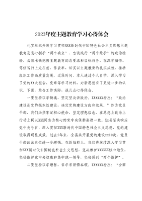 2023年度主题教育学习心得体会扎实组织开展学习贯彻XXX新时代中国特色社会主义思想主题教育是衷心拥护两个确立、忠诚践行两个维护的政治检验,必须准确把握主题教育的总要求和目标任务,在深学细悟、笃信笃行上走在前、作表率,切实以主题教育的扎实成效,推动组织工作高质量发展。近段时间,本人通过个人自学,深入学习了党的XX大报告、党章等学习材料,对新思想有了更进一步的认识。下面,结合工作实际,谈几点心得体会。一要坚持以学铸魂,坚定坚决讲政治。XXXXXX指出:政治建设是党的根本性建设,决定党的建设方向和效果。作为党员干部,我们必须牢记初心使命,坚定理想信念,在思想上政治上行动上同以XXX同志为核心的党中央保持高度一致。Xx县坚决响应党中央号召,深入贯彻XXX新时代中国特色社会主义思想,党的建设取得明显成效。过去5年来,全县共开展党的建设xx10次,党员干部政治站位进一步增强。在新征程上,我们将继续深入学习贯彻XXX新时代中国特色社会主义思想,坚决维护XXXXXX核心地位,坚决维护党中央权威和集中统一领导,坚决做到两个维护。二要坚持以学增智,常学常新强本领。XXXXXX指出:全面从严治党,首先要从政治上看清思想上弄明白。我们要提高解决实际问题的能力和水平,在学习中增长知识、明确方向。Xx县坚持知行合一,组织党员干部参加xx党校培训230人次,省委党校培训120人次,不断提高工作能力。作为xx县副县长,我将继续深入学习XXX新时代中国特色社会主义思想,结合xx县的实际情况,如县域经济以机械制造业为主,民生方面医疗资源较为匮乏等情况,不断提高工作能力和水平。三要坚持以学正风,自觉自律纠四风。XXXXXX强调:要坚决反对和克服形式主义、官僚主义。我们必须坚决整治不正之风和腐败问题,自觉遵守党纪国法,严格工作作风。x县深入贯彻中央八项规定精神,近3年来查处违反中央八项规定精神问题23起,纠正四风问题45起,党风政风进一步转变。在新征程上,我们将继续深入贯彻中央八项规定精神,坚决反对形式主义,以实际行动践行初心使命。四要坚持以学促干,有力有效抓落实。知行合一,知而后行,知行相长。我们必须把学习成果转化为工作落实,以知促行,知行结合。过去5年来,xx县认真贯彻新发展理念,县域生产总值年均增长8.5%,人均可支配收入由1.2万元增至1.8万元。作为xx县副县长,我将继续深入贯彻新发展理念,深化改革,优化营商环境,推动德化县高质量发展,让人民群众获得更多实惠。在新时代新征程上,我们将更加自觉地用XXX新时代中国特色社会主义思想武装头脑、指导实践、推动工作,以实际行动践行初心使命,为全面建设社会主义现代化国家而不懈奋斗!