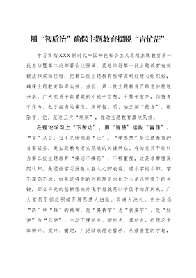 用智质治确保主题教育摆脱盲忙茫学习贯彻XXX新时代中国特色社会主义思想主题教育第一批总结暨第二批部署会议强调,要总结好第一批主题教育有效做法和成功经验,把第二批主题教育科学谋划好精心组织好,确保主题教育取得实效。当前,第二批主题教育正蹄急步稳地开展,广大党员干部要做到不驰于空想、不骛于虚声,保持善于作为、敢于担当的常态,用好智、质、治三剂药方,根除盲、忙、茫这三大顽疾,推动主题教育落地见效。在理论学习上下苦功,用智慧摆脱盲目。盲从目,目不见物则易亡。学思想是主题教育的首要任务,是主题教育落实见效的关键所在。有的党员干部认为第二批主题教育换汤不换药,不够重视,这是非常错误的认知,是理论学习没有入脑入心的表现。理不学则不知,学不深则不通。如果说将党的创新理论内化于心是以学促干的关键,那么将党的创新理论外化于行就是以学促干的落脚点。广大党员干部应积极开展思想大扫除、灵魂大洗礼,充分发扬挤和钻的精神,变要我学为我要学、变好学为乐学,主动下慢功夫、细功夫、真功夫,把理论文章掰开、揉碎、嚼烂,广泛汲取理论营养,从最需要的学起,从最基本的练起,从最薄弱的补起,坚持读原著学原文悟原理,认真研读党的XX大报告、《XXX著作选读》等重要文献资料,做到出思路、出方法、出干劲,努力把从理论学习中收获的思想方法和工作方法转化为发现问题、剖析问题、解决问题的实际对策,不断填补知识上的短板、方法上的空白、本领上的赤字以及行动上的抓瞎,促进工作质量效率双提升。在调查研究上下实功,用质量摆脱忙乱。忙从心,心不在焉则易亡。以调查研究推动主题教育走深走实,既继承发扬了我党的优良传统,也体现了新时代新征程迎接各种困难挑战的现实需要,更彰显了其蕴含的实事求是的价值内涵。XXXXXX强调,衡量调查研究搞得好不好,不是看调查研究的规模有多大、时间有多长,也不是光看调研报告写得怎么样,关键要看调查研究的实效,看调研成果的运用,看能不能把问题解决好。注重解决实际问题,归根结底是为了造福人民,不能落入形式主义的窠臼、走进作秀的误区,导致调查研究成为雷声大,雨点小的烂尾工程面子工程。广大党员干部始终带着为什么的疑惑和怎么办的求知欲,变材料上报为腿脚下访,拒绝浮在调查研究的水面东西乱抓,要综合运用蹲点调研、督查调研、典型调研、走访调研、跟踪调研等调查方法潜入水底,把问题是什么搞清楚,把问题怎么办找出来。务求深、实、细、准、效,让行动上的井然有序替代纸面上的慌张忙乱,拧干水分直击问题本质,找准解决问题的最优解,真正与民意民心同频共热,写好高质量为民卷。在检视整改上下硬功,用治理摆脱茫然。茫从水,水漫无边则易亡。XXXXXX在主题教育工作会议上强调,坚持边学习、边对照、边检视、边整改,把问题整改贯穿主题教育始终,让人民群众切实感受到解决问题的实际成效。主题教育开展得好不好,归根到底要看解决实际问题、推进整改落实的成效好不好。党员干部要在调查研究之后树立久久为功,善作善成的治理导向,时刻确保检视整改不降温不遇冷不变质。要以时时放心不下的责任感、今天再晚也是早,明天再早也是晚的效率意识,做到一针见血找寻问题,独当一面直面问题,百计千方解决问题,以刮骨疗毒、猛药去疴的决心和勇气推进整改。要坚持把当下改与长久立结合起来,在抓细、抓常、抓长上狠下功夫,对群众反应强烈的急难愁盼要列出清单,实事求是、分门别类梳理好,详细思考整改措施,对当下能改的,要立查立改、即知即改,确保主题教育成效最快惠及群众;对短期难以整改的,要做好打持久战的准备,以钉钉子精神紧盯不放、持续整改,始终做到对标对表、对账销号,让问题整改的成效走进每一位群众的家门。