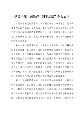 党员干部主题教育四下基层个人心得作为一名基层党员干部,我深刻认识到四下基层要求的重要性。深入基层、了解基层、服务基层和促进基层发展,是我们在工作中必须遵循的重要原则之一。通过落实这一要求,我们可以更好地推动工作,提高工作效率和质量,为人民群众提供更好的服务和保障。第一,深入基层是基础。只有真正走进基层,才能了解群众的需求和困难。在工作中,我们需要经常深入到农村、社区和企业等基层一线,与群众面对面交流,听取他们的意见和建议,了解他们的生产生活情况,为他们解决实际问题。深入基层的方式可以有很多种,比如:参加志愿服务活动、开展调研等。通过这些方式,我们可以更好地掌握第一手资料,为后续的工作打下坚实的基础。同时,深入基层还可以帮助我们更好地了解当地的文化习俗和风土人情,增强我们对基层情况的认知和理解。第二,了解基层是关键。只有全面了解基层情况,才能更好地为基层服务。在工作中,我们需要加强对基层情况的调研和分析,了解当地的经济社会发展状况、人口结构、文化习俗等情况针对存在的问题和不足,制定更加科学合理的发展规划和政策措施。了解基层的关键在于用心去听、去看、去感受。只有用心去了解基层情况,才能更好地把握群众的需求和困难,为后续的工作提供有力的支持。第三,服务基层是核心。只有切实做好服务工作,才能赢得人民群众的信任和支持。在工作中,我们需要始终以人民群众为中心,积极为他们提供帮助和服务,帮助他们解决实际问题和困难。同时,我们还应该加强与人民群众的联系和沟通,建立良好的互动关系,增强人民群众对我们的信任感和满意度。服务基层需要我们用心去服务、用情去服务、用行动去服务。只有切实做好服务工作,群众才会把我们当做自己人,当做贴心人。第四,促进基层发展是目标。只有不断提高基层发展的水平和质量,才能更好地满足人民群众的生产生活需求,也是我们工作的最终目标。在工作中,我们需要加强对基层发展的指导和支持,帮助当地企业、村庄等基层单位提高管理水平和技术水平,推动当地经济社会的快速发展。同时,我们还需要注重人才培养和引进为基层发展注入新的活力和动力。促进基层发展需要我们用心去推动、用情去感召、用行动去引领。只有通过我们的努力不断提高基层发展的水平和质量,才能让人民群众过上更加幸福美好的生活,才能实现我们的工作目标和社会价值。总之作为一名基层党员干部我们应该始终坚持四下基层要求深入基层、了解基层、服务基层和促进基层发展。只有这样我们才能更好地推动工作、提高工作效率和质量、为人民群众提供更好的服务和保障、实现我们的工作目标和社会价值;同时还可以增强我们的成就感和荣誉感、提高自身综合素质和能力水平让我们在工作中不断成长和发展、为人民群众和社会做出更大的贡献。