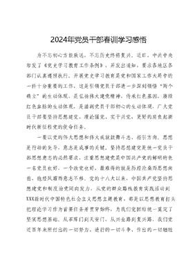 2024年党员干部春训学习感悟为不忘初心方能致远,不忘历史终将复兴。近日,中共中央印发了《党史学习教育工作条例》,并发出通知,要求各地区各部门认真遵照执行。开展党史学习教育是党和国家工作大局中的一件十分重要的工作,这是引领党员干部进一步深刻领悟两个确立的生动体现,是弘扬伟大建党精神,传承红色基因,赓续红色血脉的生动体现,是滋润党员干部初心的生动体现,广大党员干部要坚持思想建党、理论强党、实干兴党,更好的肩负起新时代新征程党的使命任务。一要以党的伟大思想和伟大成就鼓舞斗志、指引方向。思想是行动的先导,意志是成事的关键。坚持思想建党是统一党员干部思想意志的必然要求,注重思想建党是中国共产党的鲜明特色一名党员也好,一个政党也好,最难得的就是历经沧桑而思想向前、饱经风霜而意志不移。党的十八大以来,中国共产党坚持思想建党和制度治党同向发力,从党的群众路线教育实践活动到XXX新时代中国特色社会主义思想主题教育,都是以思想教育打头把理论学习作为首要任务并贯穿始终,为我们党团结统一奠定了坚实思想基础。从石库门到天安门,从兴业路到复兴路,我们党近百年来所付出的一切努力、进行的一切斗争、作出的一切牺牲都是为了人民幸福和民族复兴——这是中国共产党的宗旨,也是党员干部的共同意志。统一的思想、共同的意志是战胜任何艰难险阻的强大核心力量。新时代新征程上,广大党员干部要把学习党史作为一项重要政治任务来抓,要坚持学党史和悟思想相统一以党的伟大思想和伟大成就鼓舞斗志、指引方向,以学史明理持续推动思想上的统一、政治上的团结、意志上的坚定。二要以党的科学理论和实践创造启迪智慧、砥砺品格。百年恰是风华正茂,百年亦是挥斥方遒。坚持理论强党是增强党员干部理论自信的必然要求,中国共产党的历史与中国共产党理论体系是息息相关、密不可分的。XXXXXX指出,理论创新每前进一步理论武装就要跟进一步。开展党史学习教育是我们党加强理论武装的重要抓手和成功经验。坚持理论强党源于坚定理论自信,即坚信中国特色社会主义理论体系是指导党和人民沿着中国特色社会主义道路实现中华民族伟大复兴的正确理论,是立于时代前沿与时俱进的科学理论。从革命战争年代的红船精神、井冈山精神长征精神、延安精神到社会主义建设时期的两弹一星精神、大庆精神、红旗渠精神,再到改革开放与新时代的抗震救灾精神、载人航天精神、抗疫精神这都是百年党史之精华所在,是中国共产党理论体系之灵魂所在。广大党员干部要坚持用百年党史之精华浇灌自己,用科学理论之灵魂洗涤自己,以党的科学理论和实践创造启迪智慧、砥砺品格,在学史增信、学史崇德的过程中始终做到忠诚于党、忠诚于民。三要以党的光荣传统和优良作风坚定信念、凝聚力量。坚持以人民为中心,是贯穿党史的一条红线。坚持实干兴党是推动党员干部担当作为的必然要求,纵观百年之中国共产党历史,是一部不懈奋斗史、群众路线史、为民造福史。不懈奋斗是党员干部对信仰信念的最好诠释,为民造福是党员干部对初心使命的最亮印证。二二四年新年贺词中〇XXX指出,我们的目标很宏伟,也很朴素,归根到底就是让老百姓过上更好的日子。今年是中华人民共和国成立75周年,是实现十四五规划目标任务的关键一年更是广大党员干部踔厉奋发、勇毅前行、学史力行的一年,广大党员干部要从百年党史中把握经验、汲取力量,以人民之心为己心,以人民之利为己利,把全心全意为人民服务作为衡量学习党史成果的唯一标准,将学习党史的成果体现在为民服务、为民造福、为民奉献、为民牺牲的生动实践之中。