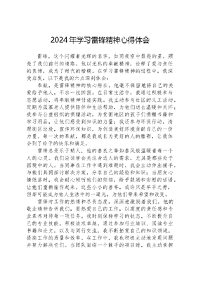 2024年学习雷锋精神心得体会雷锋,这个闪耀着光辉的名字,如同夜空中最亮的星,照亮了我们前行的道路。他以无私的奉献精神,诠释了爱与责任的真谛,成为了时代的楷模。在学习雷锋精神的过程中,我深受启发,以下是我的六点深刻体会:奉献,是雷锋精神的核心所在。他毫不保留地将自己的关爱给予他人,不求一丝回报。在日常生活中,我通过积极参与志愿活动,将奉献精神付诸实践。我主动参与社区的义工活动,定期为孤寡老人提供陪伴和生活帮助,为他们送去温暖和关怀;我参与公益组织的捐赠活动,为贫困地区的孩子们捐赠书籍和学习用品,让他们感受到知识的力量;我还参与环保行动,清理街区垃圾,宣传环保知识,为创造美好环境贡献自己的一份力量。每一次的奉献,都是我成长为更好的人的磨砺,让我体会到了给予的快乐和满足。雷锋总是乐于助人,他的善良之举如春风般温暖着每一个人的心灵。我们应该学会关注身边人的需求,尤其是那些处于困境中的人。当同事在工作中遇到难题时,我会主动伸出援手,与他们共同探讨解决方案,分享自己的经验和知识;当朋友心情低落时,我会耐心倾听他们的烦恼,给予鼓励和安慰的话语,让他们重新振作起来。这些小小的善举,或许只是举手之劳,但却可能成为他人生活中的一道光,为他们带来希望和改变。雷锋对工作的热情和尽责态度,深深地激励着我们。他的敬业精神告诉我们,要热爱自己的工作,以高度的责任感和专业素养对待每一项任务。我时刻保持学习的状态,不断提升自己的专业技能,积极追求卓越。通过参加行业培训、阅读专业书籍和论文,以及与同行交流,我不断拓宽自己的知识领域,提高工作的质量和效率。在工作中,我也积极主动地发现问题并努力解决它们。当团队面临一个棘手的项目时,我主动承担更多的责任,带领团队成员共同分析问题、寻找解决方案,并最终成功完成任务。我深知,无论工作岗位大小,都应该全力以赴,充分发挥自己的才能,实现个人价值的最大化。雷锋生活简朴,勤俭节约的品质在当今社会更显得珍贵。在物质丰富的今天,我们应当更加珍惜资源,不浪费任何一点一滴。当外出就餐时,我会适量点餐,尽量做到光盘行动,避免食物的浪费;在日常生活中,养成随手关灯、关水的习惯,节约每一度电和每一滴水;购物时,我会理性消费,注重商品的质量和实用性,不盲目追求名牌和奢侈品。同时,我也学会了理财,合理规划生活开支,制定每月的预算计划,避免不必要的消费。还要减少不必要的娱乐消费,将节约下来的钱用于投资自己的学习和成长。这种勤俭节约的生活方式,不仅让我更加懂得珍惜资源,也让我在物质欲望面前更加从容和坚定。雷锋关心集体,注重团结同志。我们要学会与他人合作,培养团队精神。在集体中,我尊重他人的意见,善于发现并发挥自己的优势,与团队成员共同为实现目标而努力。我积极参与团队活动,与同事们友好相处,在工作中互相支持和帮助。我主动分享自己的经验和技能,帮助新同事尽快适应工作;在社区工作中,我带头组织集体活动,如志愿者服务、社区文化活动等,增强社区的凝聚力和归属感。学习雷锋精神不仅要做好事,更要不断提升自己。我们应该努力学习新知识,提高自身素质和能力。我充分利用业余时间阅读各类书籍,参加专业培训课程,拓宽自己的知识面和视野。同时,我也培养了一种兴趣爱好,如绘画、摄影等,并不断挑战自我,提升个人技能。积极参加相关的比赛和展览,与其他爱好者交流和学习。通过不断进步,我能够更好地服务社会,将雷锋精神发扬光大。我坚信,只有不断提升自己,才能在实践中更好地传承和践行雷锋精神。总之,学习雷锋精神是一个长期而持续的过程。让我们将雷锋精神融入日常生活的点滴之中,用实际行动去践行。从身边的小事做起,让爱与温暖在我们身边蔓延。让雷锋精神在我们这一代继续绽放光芒,照亮世界的每一个角落。