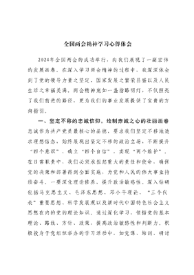 全国两会精神学习心得体会2024年全国两会的成功举行,向我们展现了一副宏伟的发展画卷。在深入学习两会精神的过程中,我深深体会到了党的领导力量之坚定、国家发展之繁荣昌盛以及人民生活之幸福美满。两会精神宛如一盏指路明灯,不仅照亮了我们前进的路径,更为我们的事业发展提供了宝贵的方向指引。一、坚定不移的忠诚信仰,绘制赤诚之心的壮丽画卷忠诚作为共产党员最核心的品德,要求我们坚定不移地追求理想信念,始终展现出坚定不移的政治立场,不断提升四个意识,确立四个自信,实现两个维护。在日常职责中,我们必须承担起重大的责任和使命,确保党的决策和部署得到全面实施,为党和人民的伟大事业持续奋斗。一要深化理论修养,提升政治敏感性。深入钻研包括马克思主义、毛泽东思想、邓小平理论、三个代表重要思想、科学发展观以及新时代中国特色社会主义思想在内的党的理论知识。通过深化学习,领悟党的基本理论、路线、方针、政策,提高政治敏感性和判断力。积极投身于党组织举办的学习活动中,如党课、培训、研讨会,与党员同志们交流思想,共同提升政治觉悟。关注时事政治,理解党和国家的重大决策,确保思想和行动与党中央保持高度一致。二要严格遵守党纪党规,树立纪律观念,深入学习党的纪律规定,包括党章、党纪处分条例等明确个人行为的界限和底线。增强纪律观念,随时提醒自己遵守党的纪律要求,不越雷池一步。自觉服从党的组织纪律,积极参与党组织的各项活动,以清廉自律的形象坚决反对任何形式的腐败和不正之风。三要全心全意履职尽责,贡献个人力量。明确岗位职责和工作目标,全心全意地执行职责,努力提升工作成效。面对任务不畏艰难,勇于承担,为实现党的目标贡献个人力量。通过不断学习和培训,提升个人业务能力和素质,以适应工作的新需求和挑战。与团队成员紧密合作,营造团结向上的工作氛围,共同为党的事业奋斗。四要积极投身党的建设,增强组织凝聚力。主动参与党组织的各类活动,如组织生活会、主题党日,为党组织的建设贡献智慧和力量。关怀和帮助党员同志,共同营造一个团结互助的党组织氛围,提升组织的凝聚力。利用个人特长和优势,为党组织的工作提供支持,如参与活动组织、开展宣传工作等。通过参与志愿服务,为社会和人民群众提供帮助,展现共产党员的先锋模文可居文库——海量学习资料,手机电脑均可下载www.wenkeju.com范作用。五要传承红色精神,弘扬党的光荣传统。深入学习党的光辉历史和优良传统,理解党的伟大成就和历史经验,增强对党的归属感和自豪感。继承和发扬党的优良作风,如艰苦奋斗、求真务实、密切联系群众等,将这些优良传统融入到日常工作和生活中。始终坚持以人民为中心的发展思想,全心全意为人民服务,通过自己的实际行动影响和带动周围人,共同弘扬党的优良传统和价值观。二、把握实干之锚,绘就兴国之彩。实干乃是中华民族伟大复兴梦想之基石,我们应怀着坚定的实干精神,勇敢地承担起责任与使命,通过行之有效的努力,为祖国的繁荣发展贡献绵薄之力。在职责所在,我们需致力于务实高效,积极响应民众所盼,力求在实践与历史的检验中铸就佳绩。一是建立健全的政绩理念。须深刻理解政绩的本质,意识到其不仅仅局限于表面的数据与指标,而更在于工作成效及对民众的实际贡献。摈弃一切形式主义与官僚作风,重视工作成效与质量,追求真实的政绩。以解决问题为出发点,将工作焦点聚集在为民众提供实际利益与服务上。二是展现责任与勇气。面临挑战与困境时,必须展现出勇往直前的勇气,不畏艰难,不回避责任。积极主动地承担起工作职责,勇于直面问题,寻求解决之道。培育文可居文库——海量学习资料,手机电脑均可下载www.wenkeju.com坚忍不拔的意志,战胜逆境心理,以积极向上的态度迎接每一次挑战,彰显责任感与决断力。三是不断提升职业能力。持续保持学习的热情,不断吸收新知识、新技能,与时俱进。通过参与培训、阅读行业资料、交流分享等多种途径,增强个人的专业能力。将学习成果应用于实际工作之中,有效解决工作难题,提升工作效率与成果质量。四是重视创新与实践。积极探索创新的工作思路与方法,勇于实施创新策略。培育对创新的渴望,紧跟行业发展趋势与新技术,将其融入工作实践中。鼓励团队成员贡献创新想法与建议,共同研究探讨新型工作模式与方法。通过持续的创新实践,推动工作向前发展,实现卓越成果。五是营造协作共进的环境。建立有效的沟通平台,强化团队内部的交流与合作。尊重每位成员的观点与建议,充分利用团队的多元优势,齐心协力迈向共同目标。培养浓厚的团队精神,互帮互助,共同面对挑战。通过团结协作的力量提升工作效率,共同创造一个和谐、高效的工作氛围。三、厚植为民情怀,勾画以民为本的精神图谱。以民为本是我们工作的核心理念和最终目标,我们必须坚持以人民为中心的发展思路,不断追求满足人民对优质生活的渴望。在日常职