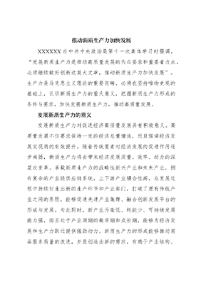 推动新质生产力加快发展XXXXXX在中共中央政治局第十一次集体学习时强调,发展新质生产力是推动高质量发展的内在要求和重要着力点,必须继续做好创新这篇大文章,推动新质生产力加快发展。生产力是马克思主义理论的重要范畴,必须在坚持唯物史观的基础上,认识新质生产力的重大意义,把握新质生产力形成的条件与要求,加快发展新质生产力,推动高质量发展。发展新质生产力的意义发展新质生产力对促进经济高质量发展具有积极意义。高质量发展不仅要求保持一定的经济总量增速,而且强调经济发展实现质的有效提升。随着传统要素对经济发展的促进作用逐步减弱,新质生产力将会带来经济发展质量、效率、动力的深层次变革。承载新质生产力的战略性新兴产业和未来产业,拥有复杂的产业链供应链系统,上下游产业耦合性高,在发展过程中持续衍生出新的生产环节和产业部门,打破了原有传统产业之间的界限,能够促进先进产业集群、融合创新发展平台的形成与发展。与此同时,新产业污染低、耗能少、可持续发展能力强,而且处于产业周期的萌芽期和成长期,能够为经济发展和生产力跃迁提供强劲动力。新质生产力的形成能够推动商品服务质量的改进,并且创造出新的需求,有助于产业结构、投资结构的优化,不断激发市场主体的活力。发展新质生产力有利于加快提升国家竞争能力。纵观历史进程,谁牢牢把握了生产力发展的方向,谁就在世界发展中占得先机。进入21世纪以来,全球科技创新空前活跃,新一轮技术革命和产业革命正在重塑世界经济格局,全球生产力体系和经济体系向着智能化、绿色化、融合化方向不断演进。世界各主要国家为抢占生产力发展制高点纷纷出台相关政策,科技创新成为国际战略博弈的重要内容。一些西方国家出于自身狭隘利益诉求,对我国重点领域、重点行业进行打压,对我国产业安全和经济安全构成威胁,实现高水平科技自立自强成为战略必然。在这样的时代背景下,加快形成新质生产力有助于提升国家竞争能力,保障国家安全。发展新质生产力能够更好满足人民美好生活需要。解放和发展生产力是社会主义的本质要求,满足人民美好生活需要是发展的根本目的。伴随着我国社会经济发展,无论是劳动者个人生活需要,还是劳动者共同生活需要,都需要以生产力的充分发展为前提。新质生产力的形成符合需求结构升级趋势,能为人民群众创造更为丰富、更加坚实的物质基础,推动人民群众的获得感、幸福感、安全感不断提升。形成新质生产力的关键因素文可居文库——海量学习资料,手机电脑均可下载www.wenkeju.com新质生产力的形成依赖于科技进步。马克思高度重视科技对于生产力的巨大作用,他指出劳动生产力是随着科学和技术的不断进步而不断发展的。XXXXXX指出,科技创新能够催生新产业、新模式、新动能,是发展新质生产力的核心要素。与传统生产力相比,新质生产力中包含着颠覆性的科技创新,比如新的科学发现、新的制造技术、新的生产资料、新的产品服务。与以往科技创新领域相对集中不同,以人工智能、5G技术、量子信息、生物工程技术等为代表的新科技涉及领域众多,涵盖了实体产业与虚拟经济,特别是一系列颠覆性技术和前沿技术处在科技发展的无人区,聚合效应明显,应用场景广泛,体现了多学科的深度交叉、融合、协同,其技术演进路线呈现非连续性和不确定性特点。发展新质生产力,必须深刻认识新科技革命对生产力的巨大作用,把新科技的研究运用及由此催生的战略性新兴产业和未来产业放在推动新质生产力形成的重要位置。新质生产力的形成依赖于新的生产方式。孤立的生产要素自身并不能形成现实的生产力,生产力是通过一定的社会形式将生产要素有机结合的系统力量,凡要进行生产,它们就必须结合起来,实行这种结合的特殊方式和方法一定的生产方式或一定的工业阶段始终是与一定的共同活动方式或一定的文可居文库——海量学习资料,手机电脑均可下载www.wenkeju.com社会阶段联系着的。联结劳动者与劳动资料的生产方式可以从企业内部的劳动过程考察。在工业化过程中,劳动过程表现为由分散走向集中的特点,生产资料、劳动者及彼此之间的空间联系紧密,规模效应凸显,生产周转时间和运输成本大大降低,劳动生产效率显著提高。而在智能化背景下,生产方式出现了深刻转变,劳动者、劳动资料、劳动对象及其组合发生了质变。通过工业互联网和数字平台,劳动者与生产资料之间不再需要进行特定时空下的直接物理结合,而是通过智能化体系实现对劳动对象的控制和转换,劳动者可以远离传统意义上的劳动场所;人工智能还能对生产需要的订单量、劳动量、设备利用率等进行精准预测,产品的模块化技术支持柔性生产,供应、制造、销售不同环节的协调成本降低,企业可以对市场多元化需求进行快速反应;依托数字系统,产业组织发生深刻变革,原材料供应商、制造企业以及研发设计、金融保险、物流运输等生产性服务企业全面贯通,形成了以