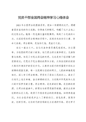 党员干部全国两会精神学习心得体会2024年全国两会的圆满召开,宛如一束耀眼的光芒,照耀着国家前进的伟大道路;仿佛春天的暖风,唤醒了这片土地上的无限生机;就像一剂充满力量的鼓舞剂,唤起了全民族的斗志。在深度吸纳两会精神的历程中,深感肩负的责任之重、使命之崇高。两会精神,是信仰之锚,是前行之鼓。在这一盛会之中,各位代表和委员携民意而来,共议国事,为祖国的明天献计献策。他们提出的议案和建议,充满智慧与热情,体现了对民众深沉的关爱。无论是关于经济腾飞的宏伟规划,还是关乎民生福祉的具体方案,从科技创新的探索之路到环境保护的坚定步伐,从教育与医疗的质量提升到社会保障的稳固支撑,每一议题都与国家的明天、人民的幸福息息相关。深入学习两会精神,更坚定了服务人民的决心,激发了在岗位上追求卓越、奋力拼搏的动力,为实践中华民族伟大复兴的中国梦贡献力量。两会精神,是改革的引擎,是创新的泉源。在两会的盛典中,新理念与新思想激烈碰撞,激发出改革创新的灿烂火花。政府工作报告提出的改革措施,如清泉般滋润,为社会经济的进步注入了新的动力。深化改革、拓展开放、创新引领,这些时代的密码转化为前进的节奏。通过学习两会精神,深刻认识到只有勇于改革创新,才能迎合时代的潮流,才能在全球竞争的大潮中稳居不败之地。两会精神,是团结的标志,是奋进的旗帜。在党的领导下,全国各族人民心手相连,共克时艰。不论是对抗疫情的壮志豪情,还是脱贫攻坚的壮丽篇章,都彰显了中华民族心连心、力拔山河的强大实力。在两会精神的激励下,我们要同心协力,凝聚起实现中国梦的浩荡力量。在今后的工作生活中,我将以两会精神为引领,努力做到以下几点:一是终身学习,素质提升。致力于深化对XXX新时代中国特色社会主义思想的理解,深挖党的指导方针及政策的内涵,吸收专业知识与技能的要义,不断增强个人的全面素质及能力层次。通过不懈的学习努力,不断丰富自我,奠定履职和优质工作的坚实基础。二是职责先行,工作尽善。坚守岗位,尽显敬业精神,勤恳致力于工作,怀揣对事业发展的高度责任心与使命感。对待每项工作任务,都力求精益求精,致力于以个人的智慧和力量为目标的实现作出贡献。三是群众之声,心之所向。始终将人民群众的福祉视为至高无上的事业,深入探寻群众的需求与期待,积极行动,解决他们的实际问题。主动融入群众之中,倾听他们的声音,关注他们的生活,文可居文库——海量学习资料,手机电脑均可下载www.wenkeju.com不断提升群众的满意度和幸福感。四是社会参与,担当尽责。自觉遵循社会公德、职业伦理与家庭美德,热心投身于志愿服务与公益事业,为社会和谐进步贡献个人力量。通过实际行为践行社会责任,传播积极向上的力量,为构建和美社会贡献绵薄之力。五是廉洁自守,品行典范。严格遵循党纪国法,自觉远离各种诱惑,坚守廉洁自律的底线。持守清正廉洁的品德,以身作则,塑造良好的个人形象,维护党和人民事业的纯洁性。两会精神作为我们奋进的重要动力和明确指引,激励我们团结前行,勇敢向前,为中华民族伟大复兴的中国梦不懈奋斗!坚信在我们的共同努力下,国家的未来定将更加光明美好!让我们携手前行,共同铸就一个时代的辉煌!文可居文库——海量学习资料,手机电脑均可下载www.wenkeju.com