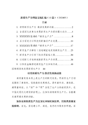 新质生产力理论文稿汇编(10篇)(202403)目录1.培育新质生产力 激活发展新动能22.全面深化改革为发展新质生产力提供强大动力..53.XXXXXX强调的新质生产力84.五方面发力以科技创新推动产业发展.145.XXXXXX强调的新质生产力.176.新质生产力解析|因地制宜地发展新质生产力237.新质生产力引领下的共同富裕之路..308.以创新人才培养赋能新质生产力发展.369.以科技金融推进新质生产力加快形成.40因地制宜地发展新质生产力44培育新质生产力 激活发展新动能高质量发展本质上是生产力的跃迁发展,而新质生产力彻底摆脱了高能耗、低效能的发展模式,具有高科技、高效能、高质量特征,以新和质实现了生产力的能级跃升。在中国式现代化建设新征程上,应加快培育新质生产力,全面激发高质量发展新动能。加快培育新质生产力应深化体制机制改革,扫除高质量发展障碍。首先,要创建公平、高效、有序的市场竞争环境,采取降低市场准入门槛、优化行政审批流程、鼓励民间创业和投资等措施,为新兴产业、未来产业的高质量发展创造更加广阔的空间。其次,要深化科技体制改革,完善科技成果评价机制,推动科研成果就地转化,提高科研经费监管成效,打造产学研协同创新平台,推广普及共性技术,凝聚创新动能。此外,要加快形成区域协调发展新模式,不断优化区域分工格局,建设完备的价值链、产业链和供应链,突破区域间壁垒,使得各类生产要素能够自由流通、充分涌动,加快建设全国统一大市场;与此同时,建立覆盖东中西部、乡村与城市、大中小城市等地区的互助共享体系,致力于实现区域互促、城乡互补的目标。加快培育新质生产力应强化核心技术攻关,提升高质量发展软实力。新质生产力的培育和发展,应当以前沿技术的颠覆创新为根本前提,基于国家提倡的大科学模式系统部署关键核心技术攻坚工作,引导各方主体紧紧围绕国家重大战略需求以创新联盟的形式联合攻关关键性和原创性的科学技术。在这个过程中,重点突出企业在科技创新中的主体地位,助推领头羊企业在技术攻关和基础研究领域发挥其重要的支撑作用;充分发挥链长企业的带头作用。同时,推动科技成果向新质生产力转变,不仅要完善科技成果转化保障制度,而且还文可居文库——海量学习资料,手机电脑均可下载www.wenkeju.com要结合现实需求组建专业的技术转化机构,建立高度配套的科技成果转化服务体系。加快培育新质生产力应加速构建现代化产业体系,夯实高质量发展产业基础,推进先进制造业高质量发展,不断提高制造业核心竞争力。一方面,大力发展智能制造,推动制造业朝着智能化、网络化和数字化的方向发展;另一方面,发展壮大先进制造业集群,加快传统制造业的转型升级进程。大力发展战略性新兴产业,前瞻布局、积极培育未来产业。聚力发展新材料、新能源、绿色环保、高端装备、生物技术、海洋装备、航空航天、新一代信息技术等新兴产业。推动现代服务业与先进制造业的融合发展,大力发展服务型制造等新兴模式,增强现代化产业体系综合竞争实力。充分发挥智能化和数字化等先进技术的驱动作用,推进现代服务业与先进制造业的深度融合;分步、分类、分阶段推动两业融合发展,全面发挥政府、企业、金融机构、高等院校以及科研机构等对两业深度融合的服务功能及支撑作用。加快培育新质生产力应创新人才培养引进管理体系,筑牢高质量发展人才保障。创新人才培养体系要以高精尖缺的现实需求为中心,重点培养服务新兴产业和未来产业的优质人才;以提高产业核心竞争力、加快培育新质生产力为引导,科文可居文库——海量学习资料,手机电脑均可下载www.wenkeju.com学合理优化学科专业结构,着重培养符合新质生产力发展需求的专业人才。创新人才引进体系要结合国家重大发展战略要求,动态调整人才引进政策举措,搭建汇聚全球高精尖人才的国际化平台,鼓励优先引进产业短板领域的高端人才。对于新质生产力催生出的新职业和新领域,应创新人才管理体制,抓紧开发制定相关的人才评价标准,并确保评价标准的动态更新。加快构建更加合理高效的科技人才系统评价体系,充分发挥各类主体在人才管理中的作用。全面深化改革为发展新质生产力提供强大动力发展新质生产力是推动高质量发展的内在要求和重要着力点,必须继续做好创新这篇大文章,推动新质生产力加快发展。发展新质生产力,既是发展命题,也是改革命题。