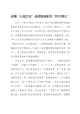 读懂以国之名高规格表彰的时代意义近日,中共中央办公厅印发了《关于做好国家勋章和国家荣誉称号提名评选工作的通知》(以下简称《通知》)。《通知》指出,党中央决定,在庆祝中华人民共和国成立75周年之际,开展国家勋章和国家荣誉称号评选颁授,隆重表彰一批为中华人民共和国建设和发展作出杰出贡献的功勋模范人物。高山安可仰,徒此揖清芬。榜样典型是一种政治力量、承载着时代的价值取向,让我们一起读懂高规格表彰背后的意义,真正做到见贤思齐、砥砺奋进,在实现中华民族伟大复兴中国梦的征途中创造新辉煌。古往今来,榜样模范都是有形的标杆、传递着无形的能量。深掘文化富矿,从三人行,必有我师焉。择其善者而从之,其不善者而改之的谦虚好学,到与善人居,如入芝兰之室的润物无声,从何妨云影杂,榜样自天成的境界修为,到光辉榜样育新葵的赓续传承……万众瞩目,高山仰止。每个人都有自己心中的英雄、有自己看齐追随的灯塔,这种能量足以激荡人的一生,引领我们在正确的航道上行稳致远。因此,观古知今间,以国之名高规格表彰功勋,本就是文化自信的体现、是美好传统的弘扬、是精神力量的激荡,只有守住我们的根和魂,让学习之风、敬佩之意、追赶之力永不息,方能源源不断造就英雄、成就非凡,此乃第一重深意。镜头拉近,党的十八大以来,XXXXXX高度重视榜样模范的表彰工作,号令全党上下对标看齐、勇争先进,为党和国家事业注入源源不断的奋斗能量、作出新贡献。回眸新时代征程,我们取得的历史性成就、创造的人间奇迹,都是各条战线上的奋斗先锋、实干担当撸起袖子干出来、拼出来的,高光成绩单浸满了辛勤的汗水、也镌刻着奉献的足迹。受表彰对象必定是各战线敢拼敢闯、知责担责、冲锋陷阵的先锋和战士,是为发展业绩、事业大局贡献了力量的中流砥柱,更是公信力强、认可度高的标杆人物。以国之名进行高规格表彰,就是应天下民心、聚万众伟力,既要做到让吃苦者吃香,更能彰显国家意志、引领社会风尚,此乃第二重深意。站在新的历史起点上,前路漫漫亦灿灿。正所谓人事有代谢,往来成古今。江山留胜迹,我辈复登临,不忘前辈创造的丰功伟绩、不负肩头的历史担当,方能代代接棒续跑,在奔赴星辰大海中绘一幅梦想图鉴。每一位平凡的中国人,怀揣着信念与赤诚、展现着担当与奉献、抱持着梦想和追求,书写了一部部奋斗史、追梦史、精神史。这些榜样人物,就文可居文库——海量学习资料,手机电脑均可下载www.wenkeju.com是14亿中国人的代表,这份记忆值得深藏、这份高光足以激荡人心。表彰、铭记,都是为了更好地出发,开展国家勋章和国家荣誉称号评选颁授,隆重表彰一批为中华人民共和国建设和发展作出杰出贡献的功勋模范人物,就是以国家仪式告诉全社会,国家和人民永远不会忘记为国家利益、人民利益奉献青春、燃烧光热的奋斗者。我们必将稳稳接棒、奋力开拓,创造经得起实践、历史、人民检验的业绩,此乃第三重深意。为什么我的眼里常含泪水,因为我对这土地爱得深沉……经历千难万险、翻越重重考验,每一位鲜活立体的榜样功勋人物,都折射着人性的高光、闪耀着精神的光芒、奔涌着奋斗的力量。以国之名开展高规格表彰颁授,不仅是对功勋人物的嘉奖肯定,也是对后人争先创优、比学赶超的鼓劲和激励。当一代代人朝着同样的目标奋斗、心怀同样的伟业和梦想,必将凝聚起磅礴力量,造就中华民族的卓越风华。文可居文库——海量学习资料,手机电脑均可下载www.wenkeju.com