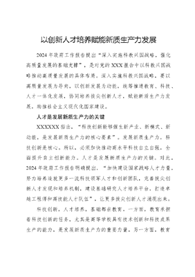 以创新人才培养赋能新质生产力发展2024年政府工作报告提出深入实施科教兴国战略,强化高质量发展的基础支撑,是对党的XXX报告中以科教兴国战略推动高质量发展的具体布局。深入实施科教兴国战略,要以高质量发展为导向,以创新发展为动能,统筹推进教育、科技、人才一体化发展,协同培养拔尖创新人才,赋能新质生产力发展,助推社会主义现代化国家建设。人才是发展新质生产力的关键XXXXXX指出,科技创新能够催生新产业、新模式、新动能,是发展新质生产力的核心要素。发展新质生产力,科技创新是核心。所以,必须加快推动高水平科技自立自强,全面提升自主创新能力。人才是发展新质生产力的关键。对此,2024年政府工作报告明确提出,加快建设国家战略人才力量,努力培养造就更多一流科技领军人才和创新团队,完善拔尖创新人才发现和培养机制,建设基础研究人才培养平台,打造卓越工程师和高技能人才队伍,让更多拔尖创新人才涌现出来。科技创新,人才培养,基础都在教育。一方面,教育承担着科技创新的任务,尤其是高等学校具有技术创新和科技成果生产的能力,是发展新质生产力的重要力量。另一方面,教育担负着培养创新人才的任务,尤其高校是高端创新人才的集聚地、创新人才培养的主阵地,为科技发展持续不断地提供动力,是发展新质生产力的动力源泉。提高人才自主培养质量培育和发展新质生产力,创新是核心要素,教育是基础。通过教育培养创新人才,为新质生产力发展提供持续的动力。人才的培养是一个长期的过程,不仅包括培养,而且包括使用。要全方位培养、用好人才,给人才创造良好条件,形成人尽其才、各展其能的良好局面。新时代以来,我国教育事业取得历史性成就,已建成世界上规模最大的教育体系,教育现代化发展总体水平跨入世界中上国家行列。各级教育普及程度达到或超过中高收入国家平均水平,接受高等教育人口超2.4亿,新增劳动力平均受教育年限达14年,劳动力素质结构发生重大变化。我国正处在从人口大国转变为人力资源强国的关键时期。但是,我们在创新人才培养上还存在堵点,钱学森之问一直是我们的痛点。我们要直面问题,就必须在提高人才自主培养质量、着力造就拔尖创新人才上下功夫,这也是落实科教兴国战略、发展新质生产力的破题之举、关键一招。建设高质量教育体系文可居文库——海量学习资料,手机电脑均可下载www.wenkeju.com2024年政府工作报告提出,加强高质量教育体系建设,把高质量发展作为各级各类教育的生命线。教育的高质量发展,最终体现在人才培养上,要适应新质生产力和强国建设的需要,培养创新人才。人才的培养是一个持续的过程,大中小学各学段都承担着相应的责任,要发挥基础教育的基点作用、高等教育的龙头作用、职业教育的枝干作用。基础教育是培养创新人才的基础。培养拔尖创新人才,尤其是拔尖创新人才的早期培养,绝对不是在基础教育中掐尖,而是要全面提高学生的各项素质,为其进一步发展奠定基础。基础教育要培养学生的求知欲、好奇心、想象力,激发学生的兴趣、爱好和动机。要加强科学教育,培养学生的科学态度、创新精神和动手能力。高等教育是创新人才的孵化地,要发挥高等教育的龙头作用。新时代,要紧紧围绕新质生产力发展需求,加快双一流建设,优化调整学科专业布局,主动对接国家对高层次紧缺人才的迫切需求,调整研究生专业。探索拔尖创新人才培养模式,对有潜质的学生早发现早培育,推动教育链与创新链、人才链深度融合。要发挥职业教育在培养新质劳动力中的枝干作用。职业教育担负着培养新质劳动力的重任。要大力提升职业教育质量,文可居文库——海量学习资料,手机电脑均可下载www.wenkeju.com面向产业核心技术发展,加强面向现代产业体系的工程教育和面向基础研究的科学教育,加强科教融汇、产教融合,打造问题导向、能力导向的实践创新教育体系,培养具有工匠精神的专业技术人才。主动适应数字经济发展需求,大力发展数字教育,造就新时代的数字工匠。文可居文库——海量学习资料,手机电脑均可下载www.wenkeju.com