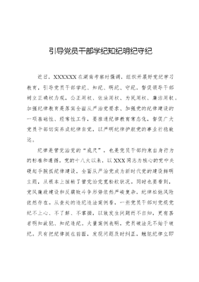 引导党员干部学纪知纪明纪守纪近日,XXXXXX在湖南考察时强调,组织开展好党纪学习教育,引导党员干部学纪、知纪、明纪、守纪,督促领导干部树立正确权力观,公正用权、依法用权、为民用权、廉洁用权。加强纪律教育是落实全面从严治党要求、加强党的纪律建设的一项基础性、经常性工作,要推进纪律教育常态化,督促广大党员干部切实养成纪律自觉,以严明纪律护航党的事业行稳致远。纪律是管党治党的戒尺,也是党员干部约束自身行为的标准和遵循。党的十八大以来,以XXX同志为核心的党中央硬起手腕抓纪律建设,全面从严治党成为新时代党的建设鲜明主题,从根本上扭转了管党治党宽松软状况。同时也要看到,党风廉政建设和反腐败斗争形势依然严峻复杂,纪律松弛风险依然存在。从查处的违纪违法案例看,一些党员干部对党规党纪不上心、不了解、不掌握,以致发生问题而不自知,更有甚者明知故犯、知纪违纪。大量案例表明,党员破法无不始于破纪。只有把纪律挺在前面,发现问题及时纠正,触犯纪律立即处置,才能防止小错酿成大错、违纪行为恶化为违法犯罪。党的XXX报告强调,全面加强党的纪律建设。二十届中央纪委三次全会要求,以学习贯彻新修订的纪律处分条例为契机加强纪律教育。要把纪律建设摆在更加突出位置,推动纪律教育走深走实、确保纪律教育入脑入心,在全党营造学纪、知纪、明纪、守纪的浓厚氛围。以学习贯彻新修订的纪律处分条例为重点,推动党员干部认真学习党的纪律规矩,把遵规守纪刻印在心。我们党历来强调要培养自觉的纪律。XXXXXX多次指出,要养成纪律自觉,把他律要求转化为内在追求。要推动广大党员干部深入学习XXXXXX关于党的纪律建设的重要论述,读原著、学原文、悟原理,深入领会加强纪律建设是全面从严治党的治本之策,注重从思想上固本培元。做好新修订纪律处分条例的学习宣传和研究阐释工作,把为什么修订、改了哪些地方、修订背后的深意等说清楚、讲明白,通过党员教育培训、专题讲座等多种形式,使党员干部进一步明确该做什么、不该做什么,能做什么、不能做什么,全面准确了解党的纪律规矩特别是政治纪律和政治规矩。以学习条例为契机,引导党员干部一体学习、贯通把握党内法规和国家法律,把纪法规定内化于心、外化于行。坚持经常性教育和集中性教育相结合,推动纪律教育常态文可居文库——海量学习资料,手机电脑均可下载www.wenkeju.com化长效化。经常性教育和集中性教育是党员教育管理的两种形态,二者紧密结合有助于使教育实效变为长效。要以学习贯彻新修订的纪律处分条例为契机,在全党开展一次集中性纪律教育。同时要把纪律教育与三会一课、民主生活会、组织生活会、主题党日活动等结合起来,融入日常、做在经常,切实将纪律教育与党性教育、廉洁教育贯通起来,让党员干部在潜移默化中增强遵规守纪的自觉。要坚持正面引导和反面警示相结合,既充分发挥正面典型的示范引领作用,又加强对反面案例的警示剖析,使党员干部心有所畏、言有所戒、行有所止。创新方式方法,提高纪律教育的针对性和实效性。纪律教育要取得实效,不能搞大呼隆一锅煮,而要坚持分层分类、因人施策,实现从大水漫灌向精准滴灌的转变。要抓住关键少数特别是一把手,做到纪法轮训全覆盖,督促领导干部在遵守和执行纪律上走在前、作表率。要结合年轻干部特点,聚焦年轻干部职业成长全周期、全流程精准化提供教育内容,引导其扣好廉洁从政第一粒扣子。要紧盯重要节点,抓住入党、新入职、新提任、节假日前后等重要时间节点做实纪律教育,加强对党员干部的监督提醒力度,督促其时刻绷紧纪律之弦。文可居文库——海量学习资料,手机电脑均可下载www.wenkeju.com纪律教育不是一时一事的要求,必须持之以恒、久久为功纪检监察机关要强化示范引领作用,先学一步、学深一层,带头学习、贯彻、遵守纪律处分条例。要将纪律教育情况纳入日常监督、巡视巡察和政治生态考核范围,对监督检查中发现的问题督促认真整改,对敷衍塞责、弄虚作假、工作不力、流于形式的严肃处理,切实把纪律教育实起来、严起来,推动铁的纪律转化为党员干部的日常习惯和自觉遵循。文可居文库——海量学习资料,手机电脑均可下载www.wenkeju.com