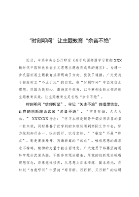 时刻叩问让主题教育余音不绝近日,中共中央办公厅印发《关于巩固拓展学习贯彻XXX新时代中国特色社会主义思想主题教育成果的意见》,为进一步巩固拓展主题教育成果明确了方向、提供了遵循。广大党员干部应树立不止于此的自觉,在时刻叩问中坚定信念理想、巩固为民初心、激扬实干担当,以干事创业新本领淬炼主题教育实效,让主题教育立足长远余音不绝。时刻叩问信仰何坚,牢记矢志不渝的理想信念,让党的创新理论武装余音不绝。学贵有恒,久久为功。 XXXXXX指出:学习本领是领导干部必须具备的第一位本领,同时要善于把学到的本领运用到实际工作中去,努力做到知行合一、以知促行、以行求知。收官不是终点,而是赓续精神、再谱新篇的起点。唯有思想的源泉永不枯竭,精神的力量才能全面迸发。广大党员干部要坚持用科学理论武装头脑,不断夯实理论根基,用党的创新理论砥砺理想信念,淬炼党性修养,从思想上正本清源、固本培元,在时刻自我叩问中坚持苟日新、日日新、又日新的钻研精神,牢牢把握以学铸魂、以学增智、以学正风、以学促干四个方面,坚持理论联系实际的学风,做到学思用贯通、知信行统一,将原原本本学理论知识和踏踏实实长本领才干有机结合,切实把字字句句的原文原理转化为真真切切服务人民、推动工作提质增效的实操本领,把学习成效转化为做好本职工作、推动事业发展的生动实践。时刻叩问初心何在,深植枝叶关情的为民情怀,让调查研究心至身至余音不绝。群之所为则事无不成,众之所举则业无不胜。XXXXXX强调:为人民而生,因人民而兴,始终同人民在一起,为人民利益而奋斗,是我们党立党兴党强党的根本出发点和落脚点。推进中国式现代化的伟大征程寄托民族梦想、承载人民期望,应牢牢坚持人民至上。广大党员干部当时刻叩问为民初心是否坚牢、作风能力是否扎实,积极践行四下基层,用好调查研究的传家宝,把坐而论道变成起而行之,扑下身子、放下架子、迈开步子,在与群众打开话匣子中掌握一手资料,在与百姓掏掏心窝子中发现一线实情,以解剖麻雀的细致和耐心,准确对光聚焦民生痛点难点,切实从就业、教育、医疗、养老等人民群众急难愁盼问题上找准症结、靶向治疗,在解决群众的个性问题中连点成线、集线成面,逐步文可居文库——海量学习资料,手机电脑均可下载www.wenkeju.com找出提升工作质效的共性方法,真正把人民群众事做成立足长久事,实实在在地提高为民服务质效。时刻叩问症结何处,坚定义不逃责的担当作为,让反躬自省自我检视余音不绝。闻过则喜,知过不讳,改过不惮。XXXXXX指出,广大干部群众最担心的是问题反弹、雨过地皮湿、活动一阵风,最盼望的是形成常态化、常抓不懈、保持长效。对于主题教育发现的问题,绝不能直接收住,检视整改不是一锤子的买卖,要增强主动性和持续性,聚焦主责主业,以抓铁有痕的毅力真改实改突出问题,坚持当下改与长久立相结合,将检视整改融入日常、抓在经常,对主题教育中的好做法,要及时总结形成经验,以制度形式固定下来,确保达到其事虽行于一时,其法足以传后的效果。对发现的问题,要分门别类有针对性地对整改成果加以巩固,对反复出现的问题,要大胆从制度上找原因,有大刀阔斧根除顽疾的决心,查缺补漏、建章立制;还要学会巧借他山之石,学习借鉴其他地区涌现出的优秀经验做法,不断在更长远的时间与更广阔的空间中释放主题教育的远期效益,交出一份无愧于时代、无愧于人民的发展答卷。文可居文库——海量学习资料,手机电脑均可下载www.wenkeju.com