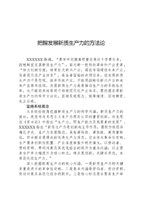 把握发展新质生产力的方法论XXXXXX强调,要牢牢把握高质量发展这个首要任务,因地制宜发展新质生产力。面对新一轮科技革命和产业变革,加大创新力度,培育壮大新兴产业,超前布局建设未来产业,完善现代化产业体系,是各省面临的共同任务。但发展新质生产力不是忽视、放弃传统产业,不能同战略性新兴产业和未来产业简单挂钩。发展新质生产力是要推动生产力的系统性变革,也不能简单地等同于构建现代化产业体系。要把握发展新质生产力的科学方法论,坚持系统观念、统筹推进、因地制宜、先立后破。坚持系统观念从系统论视角把握新质生产力的科学内涵。新质生产力的提出,是党对马克思主义生产力理论认识的重要创新。马克思在《资本论》中指出生产力,即生产能力及其要素的发展。XXXXXX指出新质生产力是创新起主导作用,摆脱传统经济增长方式、生产力发展路径,具有高科技、高效能、高质量特征,符合新发展理念的先进生产力质态。它由技术革命性突破、生产要素创新性配置、产业深度转型升级而催生,以劳动者、劳动资料、劳动对象及其优化组合的跃升为基本内涵,以全要素生产率大幅提升为核心标志,特点是创新,关键在质优,本质是先进生产力。深入把握新质生产力的核心内涵,一是新质生产力的关键变量是技术的革命性突破,二是基本内涵是劳动者、劳动资料、劳动对象及其优化组合的跃升,三是核心标志是全要素生产率的大幅提升,四是主要特征是高科技、高效能、高质量。生产力是一个复杂系统。从系统论角度看,新质生产力系统的要素,是由新型劳动者、新型劳动工具、新型劳动对象组成。新质生产力系统的产业载体,是新型要素优化组合形成的现代化产业体系,现代化产业体系通过新兴产业、未来产业占比逐步提高、传统产业深度转型升级而形成。新质生产力系统的功能,表现为全要素生产率的大幅提升。坚持统筹推进发展新质生产力是一个系统工程,涉及劳动者、劳动资料劳动对象及其优化组合的跃升,涉及科技创新、产业创新和制度创新,也涉及全要素生产率大幅提升等一系列问题。既是发展命题、改革命题,也是开放命题。统筹推进劳动者、劳动资料、劳动对象及其优化组合的跃升。新型劳动者作为新质生产力的主体,是能够创造新质生产力的科技型人才和熟练掌握新型劳动工具的应用型人才,能够适应智能化、数字化、网络化的现代工作环境。新型劳动工具是新质生产力的重要标志,工业革命的实质是生产工具的变革,新一轮工业革命生产工具的标志是智能制造系统,其创新和应用直接推动生产力的提升和社会的进步,抢抓大规模设备更新的政策契机,加快推进生产设备更新改造,有助于提升产业的智能化水平。新型劳动对象是新质生产力的重要组成部分,新型劳动对象既包括原材料、零部件等实体性劳动对象,也包括数据等非实体性劳动对象。新型要素之间是相互作用、相互关联的有机统一体,新型劳动对象的变化推动新型劳动工具的变革和应用,并迫切需要培育壮大能够熟练掌握和运用新型劳动对象的新型劳动者。统筹做好创新、改革、开放三篇大文章。一要做好科技创新大文章,构筑新质生产力的核心动力。新质生产力的核心要素是科技创新。充分发挥科技研发人才引领作用,加快推进关键性、颠覆性技术和前沿技术突破。充分发挥实验室体系支撑文可居文库——海量学习资料,手机电脑均可下载www.wenkeju.com作用,加快重大科技成果从实验室走向应用场。充分发挥企业创新主体作用,在研发投入、企业研发机构覆盖率、高新技术企业数量和科技型中小企业数量突破上持续加力。二要做好深化改革大文章,建立与新质生产力相适应的新型生产关系。要深化经济体制、科技体制等改革,着力打通束缚新质生产力发展的堵点卡点,建立高标准市场体系,创新生产要素配置方式。深圳1999年就建立了以高交会为主要平台的高科技市场交易体系,每届高交会上,科研成果与投资基金、科技企业之间的洽谈、沟通和交易,催生了大批高科技企业。加快山东科技大市场体系建设,健全科技创新市场导向制度,有助于集聚各类创新要素,提升创新资源配置效率。三要做好高水平对外开放大文章,营造发展新质生产力的良好国际环境。以水平型分工继续参与全球化进程是高水平对外开放的主要目标,未来技术换技术是我国开放新优势,扩大高水平对外开放,积极融入全球创新网络。数字时代的科技创新呈现出许多新特点,多国共同创新网络迅速涌现,数字化全球设计服务平台,可以会聚全球研发人才,同步以并联方式研发设计新产品,这种模式加强了跨国创新合作。统筹推进新兴、未来、传统三大产业载体。从产业生命周期来看,一个产业,在孕育期是未来产业,在高速成长阶段是战略性新兴产业,在成熟期是支柱产业。建设现代化产业体系就是战略性新兴产业和未来产业占比逐步提高的过程,新兴和未来产业是新质生产力孕育的重要载体,传统产业深度转型升级也是形成新质生产力的重要阵地,要推动传统产业改造升级和壮大新兴产业两