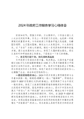 2024年政府工作报告学习心得体会好雨知时节,惊蛰万卉新。万众期待中,十四届全国人大二次会议顺利毕幕。作为上一年国家工作总结,也是新一年政策制定的重要参考,今年的政府工作报告怀抱文化底蕴、远瞻国际视野、立足国内国情,制定出六大发展目标、十大具体任务,以务实为核心关键词,制定一系列具体的举措和实施方案,展示出发展的信心决心,体现了大国的担当意志。通过认真聆听和研读政府工作报告,下面我谈一下自己的感触。一、务实笃行鼓干劲,劲风扬帆再起航今年政府工作报告内容丰富,亮点频出,从国内生产总值超过126万亿元到城镇新增就业1244万人等多项数据显示中国经济正在回升向好。面对新的一年,政府工作报告提出了明确、符合客观实际的工作目标,体现了政府对中国经济的坚定信心,也增强了企业、社会和老百姓的信心。一是延续维稳的决心。2024年经济发展主要预期目标与去年基本保持一致。特别是GDP这一核心指挥棒,即使是在2023年GDP实现增长5.2%的基础上,依然保持了与去年设定一致的目标,体现了从政策预期管理端保持稳定性和连续性,从而稳定市场预期、强化市场信心的决心。是对于中国未来发展从有信心到有把握的方向判断,释放出对于中国经济中长期发展更为积极的预期信号。同时,在2023年GDP超额实现增速目标的基础上,依然将今年的目标稳妥设定在5%左右,体现出国家层面推动经济实现质的有效提升和量的合理增长双轮驱动的决心,符合政策工具的可承受力和经济发展的可持续性,为推动新旧动能转换以及应对外部环境的不确定性预留了充足的空间。二是把握务实的核心。今年政府工作报告中出现了诸多具体数字,如单位GDP能耗,去年没有给具体降低的数字目标,今年量化为下降2.5%;城乡居民基础养老金标准,明确提出上调20元。还有各界关注的财政政策加力提效的具体部署,明确表示连续几年发行超长期特别国债,今年先发行1万亿元。粗略估算,今年政府工作报告大概不超过17000,篇幅减少,但关于新一年工作的部署却从去年的8条上升为10条,对社会经济各方的关切给予了充分的回应。再有是单位GDP能耗,去年政府工作报告没有给具体降低的数字目标,今年则对这一指标量化为下降2.5%,向十四五规划提出的单位GDP能源消耗降低13.5%目标实现更近一步,是综合考虑经济增长和能源消费弹性变化趋势作出的稳中求进的判断,以更为刚性的量化约束,展示了中国走绿色、低碳、可持续发展道路的决心和态度。三是坚持为民的恒心。首先是新增就业,2023年政府工作报告中,对这一指标的表述是城镇新增就业1200万人左右,今年将左右调整为以上。从左右到以上,更高的目标设定,符合当前依然以稳信心、强预期为核心工作的客观要求,特别是在预计今年高校毕业生超过1170万人的背景下,体现出国家稳就业工作的更大决心和力度。预计在政策面上,今年找工作的年轻人将获得来自国家更大的就业支持力度。其次是居民人均可支配收入。今年的政府工作报告中的表述是居民收入增长和经济增长同步,去年的这一表述为居民收入增长与经济增长基本同步。从基本同步到同步,体现了增加居民收入政策导向的显著增强,尤其是在扩大中等收入群体和增加低收入群体收入等方面,预计今年保障力度将有较大幅度提升。二、立足实情促发展,谋篇布局开创新征程一是创新引领,发展优质生产力。与去年政府工作报告将文可居文库——海量学习资料,手机电脑均可下载www.wenkeju.com实施扩大内需战略放在新一年工作部署的第一条不同,今年的工作部署中,大力推进现代化产业体系建设,加快发展新质生产力成为首要任务,政府工作报告中指出:充分发挥创新主导作用,以科技创新推动产业创新,加快推进新型工业化,提高全要素生产率,不断塑造发展新动能新优势,促进社会生产力实现新的跃升。这当然不意味着提振内需不再是核心问题,而是对于拉动内需的动力,我们要告别单纯的政策刺激依赖性,转向依靠生产力的变革、生产关系调整带来的经济增长方式转变、内生性地增强经济发展的韧性和弹性,以新产业发展增加就业机会,稳步推动百姓收入的增长、提高民生福祉,以新业态、新模式拓展新兴消费空间,切实解决让老百姓有钱花、敢花钱和有地方花钱的消费堵点。二是优化房地产政策,以制度建设为主。今年有关房地产的内容都集中于有关化解风险的任务中。在房地产短期风险处置方面,重心仍然是房企的资金需求,但对象从2023年政府工作报告中的优质头部房企放宽至一视同仁满足不同所有制房地产企业的合理融资需求,与中央工作会议相关内容基本一致。在健全风险防控长效机制方面,则明确提出了要适应新型城镇化发展趋势和房地产市场供求关系变化的要求,加快构建房地产发展新模式,完善相关基础性