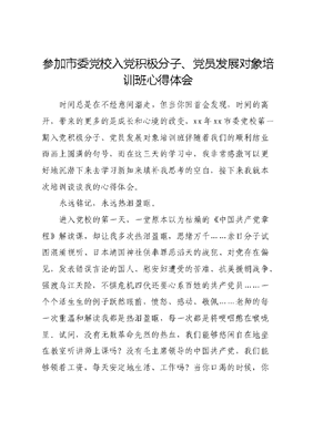 参加市委党校入党积极分子、党员发展对象培训班心得体会时间总是在不经意间溜走,但当你回首会发现,时间的离开,带来的更多的是成长和心境的改变,xx年xx市委党校第一期入党积极分子、党员发展对象培训班伴随着我们的顺利结业而画上圆满的句号,而在这三天的学习中,我非常感激可以更好地沉潜下来去学习新知来填补我思考的空白,接下来我就本次培训谈谈我的心得体会。永远铭记,永远热泪盈眶。进入党校的第一天,一堂原本以为枯燥的《中国共产党章程》解读课,却让我多次热泪盈眶,思绪万千……亲日分子试图混淆视听、日本靖国神社供奉罪恶滔天的战犯、对党存在偏见,发表错误言论的国人、慰安妇遭受的苦难、抗美援朝战争、强渡乌江天险,不惧危机四伏还要心系百姓的共产党员……一个个活生生的例子跃然眼前,愤怒、感动、敬佩……老师的每一次重温和解读我都是热泪盈眶,每一次都是将哽咽憋在喉咙里。试问,没有无数革命先烈的热血,我们能够悠闲自在地坐在教室听讲师上课吗?没有毛主席领导的中国共产党,我们能够领着工资,每天安定地生活、工作吗?当你口渴的时候,你会感激给你递过一杯水的人;当你困难的时候,你会感激助你渡过难关的人;当你迷惑的时候,你会感激给你心灵启迪的人。但是面对给予我们和平、安定、幸福的党和祖国,我们感恩了吗?很多人对我们的党存在着明显的偏见,而且是跟风的偏见,丝毫没有主见的偏见。我们不得不承认,部分党员的作为的确影响和破坏了党和国家的形象,这就是咱们常说的好事不出门,坏事传千里,再正常不过。但是在几千万党员干部中,多少人勤勤恳恳、呕心沥血,我们看见了多少、又知晓了多少?党员不是贬义词,而是一种无上的荣誉,党员只是一重需要你更加严格要求自己的身份。我们是谁虽然重要,但更重要的,是我们要做什么,怎样去做好。我们要做的便是有一份力,便出一份力,有一份光,便发一份光。吾辈青年,皆要有家国情怀和责任担当,我们怎样,中国便怎样,我们有光,中国便不会黑暗。星光不负赶路人,时光不负有心人。2020年提笔写下入党志愿书时,我热泪盈眶,从那一刻开始我就告诉自己:你身上多了一份使命,你也必须为了这份使命去不断进步和自我完善。去年开展党史学习教育,我这个学渣逼迫自己开始学习党史,开设了党史红色小广播栏目,每天推送党史小故事和各位蓝朋友分享,学习和分享之余我也不断的在进行自我知识革新和思想净化,对党史的每一次重温,文可居文库——海量学习资料,手机电脑均可下载www.wenkeju.com都是对我入党初心的叩问、精神的洗礼和行动的指引。愈是学习,愈觉得自己知识的匮乏。路漫漫其修远兮,吾将上下而求索,未来的路还有很长,我们应当从勤于学习上入手,加强能力建设,做到无一时不学,无一事不学,无一处不学,不断提高自身文化素质和政治素养。一批批先烈奋不顾身,为国捐躯的那一刻;新疆牧民大叔说不要钱,亮出党徽的那一刻;有任何危急任务,我是党员我先上的那一刻;抗疫一线亮起党员中国红的那一刻;看《长津湖》让自己苦到五脏六腑的那一刻……每一刻我都热泪盈眶,热血沸腾。热泪盈眶是一种能力,也是生命力,我庆幸我一直拥有这种能力。人想哭便能被感动,想笑便能被点燃,永远有敏锐地感知世界的能力,永远有积极地面对未知的热情。激励青春,向梦想出发。三天的学习,令我感触最深的当属中国共产党理论指导的深入研究和党员的实际应用。关于理论学习部分。高中、大学时期阅读马克思主义哲学原理时常觉晦涩难懂,殊不知其理论背后所深深埋藏的是处于底层社会的人民内心深处不敢声张的渴望,是无力与资产阶级抗衡而只能为生活选择被剥削、被压迫的能力,是资本主义私有化下众数无产阶级民不聊生、社会本身千疮百孔、病灶重重的现状描述。他的思想的最伟大之处文可居文库——海量学习资料,手机电脑均可下载www.wenkeju.com在于拥有救治社会国家之雄心,马克思用毕生去实现共产主义,很难想象在数百年之后的今天他的思想仍经久不衰,中国化的马克思主义理论至今仍不断创新与延续,因此,中国从灰烬中看见光,从光里看到了共产主义的未来,可见其前瞻性和先进性。同时从另一个角度看,马克思终其一生都是为了寻找社会的良方,实现科学共产主义。即就是在这样的社会中,所有人都是幸福满足,没有阶级利益的争夺,全面而自由,那么试问这样的社会,除去资产阶级利益受损的少部分人,还会有人不喜欢吗?而作为人类命运共同体的一份子,这种建设良性美好社会的愿景不应该再是一个虚无的口号,应该勇于去挑起这份责任和义务,身先士卒,让其他人感受到共产主义发展后的进步且共同加入到建设社会主义和共产主义中来,只有为其前赴后继的一代代人类不断奋斗,才能真正实现蓝图中的明天,而作为一名准共产党员,正是需要率先冲到第一位。关于实际行动之于党员。我们要学会党的批评与自我批评精神,正视自己的正面,去感受