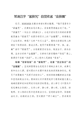 常诵四字紧箍咒自觉收紧金箍圈近日,XXXXXX在重庆考察时再次强调,脑子里要有个紧箍咒。反腐败永远在路上,没有敬畏感就会迷了道。紧箍咒一词出自《西游记》,小说中前往西天取经的唐僧就是靠念紧箍咒收紧孙悟空头上的金箍圈,束缚教化了生性顽劣、神通广大的齐天大圣,最终在孙悟空等人的辅佐下取得真经、修成正果。党员干部要常诵学、慎、省、廉四字紧箍咒,自觉收紧坚定信念、规范言行、高尚品德、洁身自好的金箍圈,在新时代新征程的取经路上,取得实干实绩真经,交上党和人民满意答卷。常诵笃学笃信的紧箍咒,收紧坚定信念的金箍圈。坚定的理想信念是党员干部的立身之本、成事之基和动力之源。面对国内外发展环境发生的深刻复杂变化,党员干部要做到风雨不动安如山,时刻保持清醒的政治头脑和坚定的政治方向。要深刻认识开展党纪学习教育的重大意义,准确把握学纪知纪明纪守纪的目标要求,深入学习《中国共产党纪律处分条例》,在用心学、静心学、潜心学,认真思、细致研、专心悟的过程中把准政治方向、坚定政治信仰、保持政治定力、站稳政治立场,坚定拥护两个确立,坚决做到两个维护,切实把党章党规的他律要求转化为内在追求和行为准则,做到真学真用、信守笃行、知行知止、令行禁止,自觉做政治上的明白人、清醒人、老实人。常诵慎独慎微的紧箍咒,收紧规范言行的金箍圈。党员干部的一言一行不仅代表个人修养,更代表党的形象和作风。党员干部要做到严守规矩行自正,始终把纪律和规矩挺在前面,不断加强自我约束,端正言行举止,做到慎独慎微、慎言慎行。要自觉接受纪律和法律约束,始终对党纪法规保持敬畏之心和戒惧之意,切实把遵规守纪内化为日用而不觉的言行准则。莫显乎微要在秋毫微末处保持如履薄冰,做到言行得体,不在小事小节上失守失控;莫见乎隐要在私下无人时保持内心平静,做到高度自律,不因无人监督而放纵、越轨、逾矩,时时刻刻事事处处严格要求自己,规范言行举止,做到大事小事无差别,人前人后一个样,确保本色做人、本分做事,表里如一,言行一致。常诵自省自警的紧箍咒,收紧高尚品德的金箍圈。党员干部的道德品质直接关系到党在人民群众心中的地位和威信。党员干部要做到一片冰心在玉壶,时刻警醒自己,坚守道德底线,以一颗无欲无求无私无我的为民服务之心,做到秉公用权、不偏不倚、公平正义、公道正派。要文可居文库——海量学习资料,手机电脑均可下载www.wenkeju.com常修为政之德,努力涵养对党忠诚、信念坚定的大德,守好为民谋福、勤勉担当的公德,修好克己奉公、自立自强的私德,做崇德向善、严守纪律的引领者、带头人。要常怀律己之心,增强不畏人知畏己知的自觉性,在吾日三省吾身中不断提升道德修养、强化职责担当、改进工作作风、狠抓工作落实,以大公无私的高尚品德和为民排忧解难的务实行动,赢得群众的支持与拥护,成为群众信赖和效仿的榜样。常诵廉洁自律的紧箍咒,收紧洁身自好的金箍圈。腐败是一颗恶性肿瘤,一旦出现就会肆意生长、转移扩散,危害党的肌体健康。党员干部要做到不为富贵移寸心,坚决抵制糖衣炮弹诱惑,守好清正廉洁底线。要牢固树立正确的人生观、价值观、事业观、政绩观,以不慕虚荣、淡泊名利为做官准则,以不务虚功、务实求效为做事守则,以克勤克俭、淳朴厚道为做人原则,自觉做经得起考验、耐得住寂寞、守得住清贫、稳得住心神、顶得住歪风的党员干部。要守住廉洁本心、做到洁身自好,不在纸醉金迷的娱乐场所沉沦迷失、腐化堕落;不在觥筹交错的酒桌饭局丢失本心、丧失底线;不在清水衙门的基层一线损公肥私、侵占群众利益,确保无论何时何地何种身份何种环境,都老老实实做人、坦坦荡荡做事,清清白白为官、干干净净用权。文可居文库——海量学习资料,手机电脑均可下载www.wenkeju.com
