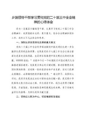 乡镇领导干部学习贯彻党的二十届三中全会精神的心得体会作为一名基层乡镇领导干部,认真学习党的二十届三中全会精神后,我深感使命光荣、责任重大。结合全会精神和实际工作,我有以下几点体会和思考。一、深刻认识全面深化改革的重大意义党的二十届三中全会科学谋划围绕中国式现代化进一步全面深化改革的总体部署,这既是党的十八届三中全会以来全面深化改革的实践续篇,也是新征程推进中国式现代化的时代新篇。XXXXXX指出:当前和今后一个时期是以中国式现代化全面推进强国建设、民族复兴伟业的关键时期。面对纷繁复杂的国际国内形势,面对新一轮科技革命和产业变革,面对人民群众新期待,必须继续把改革推向前进。通过学习,我深刻认识到,改革开放是决定当代中国命运的关键一招,是实现中华民族伟大复兴的必由之路。作为基层干部,我们必须勇于解放思想、开拓创新,坚决破除各种思想观念的束缚,勇于突破利益固化的藩篱,为深化改革贡献力量。二、坚持以人民为中心,切实增进民生福祉全会强调,要坚持以人民为中心的发展思想,扎实推进共同富裕。XXXXXX指出:最深刻的变化在于人,最根本的利益归于人,最强大的动力源于人。这让我深刻体会到,作为服务群众的最后一公里,乡镇工作必须始终坚持人民立场,把增进民生福祉作为改革发展的出发点和落脚点。我们要深入贯彻新发展理念,大力实施乡村振兴战略,加大民生投入,完善公共服务,健全基层治理体系,切实解决群