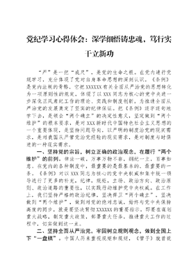 党纪学习心得体会:深学细悟铸忠魂,笃行实干立新功严是一把戒尺,是党的生命之根。在党内进行党规学习,充分体现了党对自身革命思想的深刻认识。《条例》是党内法规的骨骼,它把XXXXXX有关全面从严治党的思想转化为一项原则性的规定,体现了以XXX同志为核心的党中央进一步深化正风肃纪工作的理论、实践和制度创新,为推进全面从严治党的发展奠定了坚实的纪律保证。把《条例》逐字逐句地学下去,是领会两个确立的决定性意义,坚定做到两个维护的根本要求,是对XXX新时代中国特色社会主义思想的一个重要体现,是坚持问题导向,以严明的制度治党的现实需求,是对我国从严管党治党经验的现实需求,是对制度与时俱进的一种现实需求。一、坚持党的宗旨,树立正确的政治观念,在履行两个维护的前列。律法一破,万事万物不存,纲纪一立,百事如意。在党内的各种制度中,最重要的是最基本的、最重要的一条。《条例》对以XXX同志为核心的党中央权威和集中统一领导进行了更多的补充,纪律,规矩,立场、政治方向、政治原则、政治道路的重要性,以实践行动维护党中央权威。在工作上,我们坚持严格的政治纪律,坚决捍卫两个确立,坚决做到两个维护,做到对党的绝对忠诚,始终与党中央保持高度的同步,就是要坚决贯彻XXXXXX的重要指示,即要在谋划重大战略,制定重大政策,部署重大任务,推进重大工作的过程中,切实做到这一点。二、坚持全面从严治党,