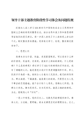 领导干部主题教育阶段性学习体会及问题检视近期本人深入学习XXX新时代中国特色社会主义思想和牢固树立正确政绩观的重要论述,结合全局年度工作和基层调研等征集到的意见建议,进一步深入查找了个人政绩观上存在的不足,制定整改落实措施。现将有关学习、检视、整改情况报告如下。一、思想认识政绩本身与价值、利益、发展紧密联系,可以说有什么样的价值观、利益观、发展观,就有什么样的政绩观。什么是政绩?什么是政绩观?通过学习习XXX对政绩观的系列论述,我有了清醒的认识,就是要把自我评价角度调整到和外部、和人民的评价角度一致,做到全心全意为人民服务。我们的所作所为,群众满意、下属满意,就是最大的政绩。只要坚定为人民干事业的思想基础,就不会计较个人得失。想群众之所想,急群众之所急,情为民所系,权为民所用,就是正确的政绩观。为此,要做到心中四有:一是心中有党。党的历史上,无数先烈能够视死如归,像李大钊、方志敏、夏明翰,根本支撑是坚定的理想信念。反之,共产党员没有理想信念或理想信念不坚定,就会腐化变质,得软骨病。党的十八大以来,全国纪检监察机关立案审查案件**万件,查处了**万人,给予党纪政务处分**万人。作为一名党员领导干部,要从革命先烈的事迹中汲取精神力量,从典型案例中吸取深刻教训,切实增强四个意识,坚定四个自信,做到两个维护,始终保持一颗对党忠诚之心,做共产主义理想的坚定信仰者和中国特色社会主义信念的忠实践行者。二是心中有民。XXX多次告诫广大党员干部:忘记了人民,脱离了人民,我们就会成为无源之水,无本之木,就会一事无成。历史上多少封建帝王以及国民党反动派,他们不顾广大人民的生死,只追求个人的享受而脱离人民,最终受到人民的反对而趋于灭亡。这样的历史教训不可谓不深刻。要始终把人民利益放在首位,恪守立党为公、执政为民理念,把人民群众的小事当作自己的大事,从人民群众关心的事情做起,为群众办实事、解难事,当一名人民满意的答卷人。三是心中有戒。进入新时代,党员干部更应该加强相关的法律法规、规章条例的学习,知底线、存戒惧。近年来,**等严重违纪违法案件给我们带来了负面影响,也为我们敲响了警钟。无论哪个级别的干部,只要违背人民的利益,终将受到党纪国法的严惩。在日常工作中,要多学习、多反思、多警示,持续加强自我修养,做到心有所畏、言有所戒、行有所止。四是心中有数。对工作开展、落实情况要一抓到底,切忌不善深入、不敢碰硬、点到为止。说到底,就是工作重要求、轻落实,重形式、轻内容,重过程、轻结果,甚至收到任务随手转给下级,指望下级能自觉执行、自动落实。领导干部必须坚持实事求是、真抓实干的作风,要扑下身子、深入基层,扎扎实实做好调研工作,了解基层所思所想、所求所盼,把工作落实在基层、把问题解决在基层。二、整改情况去年本人共检视出**项问题,制定了**个方面的整改措施。经过深入盘点自查,**个方面的整改措施均已落实到位,并转入长期坚持。理论学习上,始终坚持用XXX新时代中国特色社会主义思想武装头脑、指导实践、推动工作,把好世界观、人生观、价值观的总开关;政治觉悟上,始终坚持正确的政治立场,提升政治三力,同不良现象、不良行为作斗争,坚决反对好人主义;纪律意识上,始终坚持底线思维,加强自律规范,严格遵守党员领导干部廉洁从政准则,绝不以权谋私;能力本领上,始终坚持从实际出发,积极转变角色,不断增强工作的前瞻性,切实提升统领全局的能力和创新能力。三、存在不足(一)理论学习的钻研还不够深入。今年来,肩上的责任更重,面临的工作任务也更加复杂。因而,不自觉会把更多的精力和时间放在业务钻研上,如**、**等以往涉猎未深的业务,在对党中央最新理论成果的深入学习上精力分配有所减少。(二)站在全局角度思考谋划长远工作有待进一步提高。与优秀党员干部相比,个人的大局观、长远观、整体观仍有一定差距,对政绩停留于领导认可、群众满意的层面,没有达到既做显功又做潜功的长远效果。日常工作中,更多是围绕上级部署和考核指标开展工作,一些打基础、有利于单位长远发展的思考和落实还有待提升。(三)为群众排忧解难还不够及时。目前对全局工作和一些历史遗留问题了解掌握得不够彻底。因此,有时面对基层反映的疑难问题,出于对情况的不了解,也出于求稳心理,未能及时做出决策部署、给予解决办法,回应群众关切还有待提升。(四)激活队伍活力方面仍有差距。当前队伍活力稍显不足,工作作风有待进一步提升,未能有效地调动全体队伍的工作积极性。如有的工作主动性不高,有的工作干劲不高,有的面对新知识态度较为消极,跟不上高质量发展步伐等等,这些个别现象或多或少也影响到队伍的整体精气神,影响队伍践行正确的政绩观。四、改进措施一是深化理论武装,打牢思想根基。坚持把加强理论学习作为抵御问题的防火墙,结合主题教