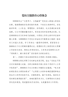 党校主题教育心得体会XXXXXX作出为党育才、为党献策党校初心的重大原创性论断,强调要继续深化党校教育规律、干部成长规律研究,深化教学科研、人才队伍、管理服务、作风建设、机关党建改革发展创新,以办学质量的整体提升,更好服务党和国家事业发展。这是XXXXXX站在历史和时代的高度,对党校工作作出的科学总结和重大部署,与XXXXXX关于党校办学治校系列重要指示精神一脉相承又有重大发展。学习贯彻这一重要讲话精神,要紧密结合XXXXXX关于机关党建的重要论述,把握新征程上XX党校机关党建工作的时代特征、XX特点和党校特色,为率先实现XX现代化和育XX英才、献兴路良策提供强有力的政治保证。第一,把握时代特征是XX党校机关党建工作的根本属性。XXXXXX全景式回顾了党校事业发展历程,指出党校在不同历史时期的重大成就、光辉业绩都是在服从服务于党的中心工作中取得的。XXXXXX关于机关党建工作重要论述强调:机关党的建设是机关建设的根本必须深入分析和准确把握规律特点使各项工作更体现时代性、把握规律性、富于创造性,推动机关党的建设高质量发展。准确把握历史方位,以鲜明的时代特征深化党的建设,既是重要的历史经验,也是重要的工作原则。1922年7月,党的二大通过的党章就把机关党建提上议事日程,之后在革命、建设、改革各个时期,都始终坚持围绕党的中心任务始终把机关党的建设摆在重要位置,始终注重发挥机关党的建设的政治优势和重要作用。在XX党校的发展过程中,始终坚持以增强党性教育为核心,把机关党建工作与教学科研中心工作紧密结合起来,加强教职工思想教育,加强学员党性教育,开展廉洁自律、爱岗爱校教育,努力做到教书育人、服务育人、管理育人。踏上新征程,XX党校机关党建工作要深刻认识把握XXX新时代中国特色社会主义思想是建设中国式现代化的科学思想指南、坚持中国共产党的领导是建设中国式现代化的最高政治原则、马克思主义在意识形态领域的指导是建设中国式现代化的强大精神力量,必须顺应时代趋势、把握时代规律,以强烈的历史主动精神,坚持政治统领,营造浓厚政治氛围,紧扣率先实现XX现代化的中心任务,创新党建工作形式、丰富党建工作内容,不断增强教职工队伍干事创业的政治热情,把三个务必要求贯穿到党建工作全过程,把对两个确立决定性意义的深刻认识,转化为坚决做到两个维护的具体行动,走好政治机关建设、模范机关创建的第一方阵。第二,把握XX特点是XX党校机关党建工作的内在要求。XXXXXX强调:服务中心、服务大局,是党校事业必须始终坚持的政治站位,是践行党校初心的必然要求。XXXXXX对XX工作作出的一系列重要指示批示,是XX事业高质量发展的根本遵循更是为提高XX党校机关党建工作质量、更好育XX英才、献兴路良策提供坚强保证。踏上新征程,XX党校机关党建工作,要始终坚持围绕中心、服务大局的政治站位,深刻把握国家XX、人民XX的战略定位,教育引导广大教职工深入研究XX服务和支撑中国式现代化建设背后的理论逻辑、历史逻辑和现实逻辑,在全路学习贯彻XXX新时代中国特色社会主义思想主题教育中发挥党校作用;教育引导教研人员积极培育XX情结,走进15万公里XX线、走近200万XX职工,总结一线原创经验、掌握基层鲜活事例、提炼中国XX精神,用学术讲好中国XX故事,在现场调研的摸爬滚打中形成有理论高度、有深厚感情、有浓浓XX烟火气息的精品课题。第三,把握党校特色是XX党校机关党建工作的重要责任。XXXXXX强调:党校因党而立,党校姓党是天经地义的要求党校姓党是党校工作的根本原则,也是做好党校工作的根本遵循。持续加强党校机关党的建设,是党的全面领导在党校工作的具体贯彻和体现,是坚持党校姓党根本原则的必然要求。踏上新征程,XX党校机关党建工作要把党的政治建设作为第一位要求紧紧围绕育XX英才、献兴路良策中心任务,完善工作机制,探索具有党校特色的党建工作路径。坚持在直属机关党委和校务委员会领导下由机关党委具体负责的工作机制。按照《中国共产党党校(行政学院)工作条例》和国铁集团党组贯彻意见,XX党校校务委员会全面领导党校工作,履行全面从严治党主体责任,把党的领导贯穿办学治校全过程各方面,分管日常工作的副校长是校机关党建工作第一责任人,校机关党委书记和各党支部书记是机关党建工作的直接责任人,机关党委副书记协助机关党委书记抓好机关党建工作,校委班子其他成员落实一岗双责,抓好职责范围内的党建工作;校机关党委在直属机关党委和校务委员会领导下具体负责机关党建工作。坚持党建与业务深度融合的工作方法。立足党校实际,以教学管理部门党支部与中青班学员临时党支部联学联建、教研部门学术型党支部品牌建设为抓手,推进党建和业务相互融合、相互促进。在联学联建方面,联合举办三会一课、联合