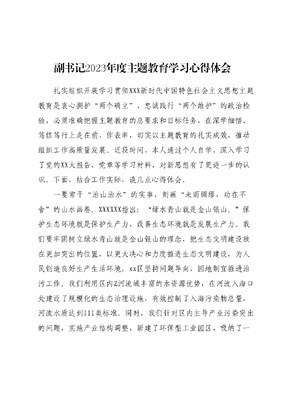副书记2023年度主题教育学习心得体会扎实组织开展学习贯彻XXX新时代中国特色社会主义思想主题教育是衷心拥护两个确立、忠诚践行两个维护的政治检验,必须准确把握主题教育的总要求和目标任务,在深学细悟、笃信笃行上走在前、作表率,切实以主题教育的扎实成效,推动组织工作高质量发展。近段时间,本人通过个人自学,深入学习了党的XX大报告、党章等学习材料,对新思想有了更进一步的认识。下面,结合工作实际,谈几点心得体会。一要常干治山治水的实事,刻画未雨绸缪,功在不舍的山水画卷。XXXXXX指出:绿水青山就是金山银山。保护生态环境就是保护生产力,改善生态环境就是发展生产力。我们要牢固树立绿水青山就是金山银山的理念,把生态文明建设放在更加突出的位置,以更大决心和力度推进生态文明建设,为人民创造良好生产生活环境。xx区坚持问题导向,因地制宜推进治污工作。我们利用区内Z河流域丰富的水资源优势,在河流入海口处建设了规模化的生态治理设施,有效控制了入海污染物总量,河流水质达到III类标准。同时,我们针对区内主导产业污染突出的问题,实施产业结构调整,新建了环保型工业园区,吸纳了一批绿色产业企业入驻,使得二氧化硫、氮氧化物排放量较上年同期下降了15%和10%。在生态环境治理方面,我们将继续坚持问题导向,统筹区域内水、气、土壤等污染防治工作,持续推进污染防治设施建设,为美丽中国建设贡献xx区的力量。二要常谋显山露水的成绩,刻画因地制宜,以点带面的山水画卷。XXXXXX强调:绿水青山就是金山银山,荒滩就是黄金。我们要牢固树立在生态环境保护中求发展的理念,把环境治理和经济发展紧密结合,在治理生态环境的同时促进经济社会又好又快发展。xx区因地制宜,大力发展生态旅游业。依托区内独特的自然山水资源,我们打造了A生态旅游区、B生态旅游小镇等生态旅游品牌,成功将环境保护与旅游业发展相结合,为群众提供了就业岗位,增强了获得感。同时,我们积极引导农民在保护生态的前提下发展特色种植业,如柑橘、茶叶等,为农民增收。我们将继续发挥区位和资源优势,因地制宜发展特色产业,在生态环境保护中谋求经济发展,以点带面提升群众获得感三要常亮青山绿水的颜值,刻画统筹兼顾,凸显价值的山水画卷。XXXXXX强调:绿水青山就是金山银山,要绿水青山亮出金山银山的底色来。我们要牢固树立生态环境保护就是生产力保护的理念,统筹区域发展与生态环境保护,在发展中保护,在保护中发展,使生态环境保护成果转化为群众的福祉xx区在推进生态环境综合治理的同时,注重提升生态环境质量和美化城镇面貌。我们对区内所有建成区和乡村进行了全面环境整治,新建和改造了一批环境设施,使城镇面貌焕然一新。同时,我们深入开展创建国家园林城市和美丽乡村工作,打造生态宜居环境优美的家园,让群众在优美环境中工作生活,使生态环境保护成果更好地惠及人民。在新征程上,我们将继续统筹区域发展与生态文明建设,在提升环境质量的同时,注重环境美化,以优美生态环境增强人民群众的获得感、幸福感、安全感。通过这次主题教育的学习,我深刻认识到,生态环境保护是关系人民群众福祉的大事,我们要牢固树立绿水青山就是金山银山的发展理念,把生态文明建设作为头等大事来抓,以更大决心抓好各项工作。在新时代新征程上,我们将继续坚持问题导向,因地制宜推进生态环境保护,在治理环境的同时促进经济发展,不断提升环境质量和美化面貌,以优美环境增强人民的获得感、幸福感、安全感。我们一定要以XXX新时代中国特色社会主义思想为指导,统筹发展和环境保护,为建设美丽中国作出应有的贡献