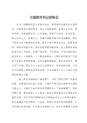 主题教育书记谈体会近日,XXXXXX在浙江考察时指出,要坚持和加强党的全面领导、加强和改进党的建设。树立正确政绩观,坚持立足实际、科学决策,坚持着眼长远、打牢基础,坚持干在实处、务求实效,防止形式主义、官僚主义。加强干部教育培训和实践锻炼,健全干部担当作为激励保护机制,激发干部干事创业活力,构建亲清统一的新型政商关系。各级党组织要加强对第二批主题教育的组织领导和工作指导,把握不同层级、不同领域、不同对象的特点结合实际,分类指导,上下联动抓整改,让群众看到实效广大基层干部要认真领悟精神,自觉加强思想锤炼、提升党性修养、强化实干本领,努力在个人岗位上创造更多、更具体的功绩,以实际行动展现主题教育的落地成效,为全面建成社会主义现代化强国贡献强大力量。一要上好思想锤炼的基础课,书写理论过硬的基层答卷。回顾党的百年奋斗历程,中国共产党之所以能够历久弥新不断壮大,关键在于始终紧抓思想建设这一基础课题,坚持思想兴党、理论强党。广大基层干部务必要聚焦党员思想理论层面的发展,坚定不移以XXX新时代中国特色社会主义思想为指导,努力读懂其中的世界观、方法论,做到以先进思想洗涤精神、以科学理论武装头脑、以正确方法指导工作。基层干部要树立终身学习的意识,努力保持学习的热情,做到与时俱进、常学常悟,紧抓主题教育等一切学习提升机会,补足精神之钙、修正理论偏差,为国家基层建设事业积蓄强大的精神力量。二要上好党性修养的必修课,书写政治坚定的基层答卷。为政之道,修身为本。回首百年党史,党性修养始终是贯穿党发展建设历程的永恒课题,成为党员干部立身、创业、建功的坚实基础。在全面建成社会主义现代化强国的新征程上,我们比以往面临着更加严峻的风险和挑战,更加迫切要求党员干部加强党性锻炼,提升政治涵养。新时代基层干部要以更加严格的标准要求自己,时刻牢记党员身份、摆正政治位置,在实际工作和生活中牢牢守住思想关、政治关、权力关,始终保持政治清醒和政治定力。基层干部要加强自我反省,以主题教育为契机,树立好自身对照镜,不断审视自我、提升自我,展现政治合格、涵养优秀的党员精神风貌。三要上好创业实干的强化课,书写担当作为的基层答卷。XXXXXX曾在讲话中强调,知是基础、是前提,行是重点是关键,必须坚持以知促行、知行合一,在理论指导实践的过程中创造出真正的成果和实效。广大基层干部要树立好实干意识在实际工作中不仅要做到动动脑,更要做到迈开腿,以问题为导向,深入调查研究,认真开展实践,用实际行动回应和解决人民群众急难愁盼的问题。基层干部要提高担当魄力,敢于涉基层中的深水区,敢于啃工作中的硬骨头,在应对困难、化解困难的实践过程中学真知、壮筋骨、增才干,不断增进担当作为、知行合一的本领,以拼搏实干之姿书写基层振兴奋斗篇章。
