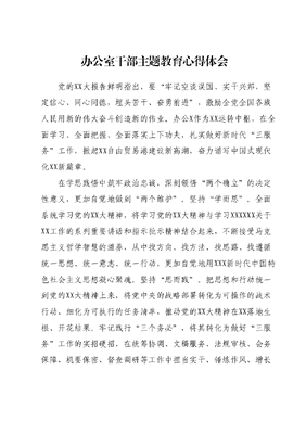 办公室干部主题教育心得体会党的XX大报告鲜明指出,要牢记空谈误国、实干兴邦,坚定信心、同心同德,埋头苦干、奋勇前进,激励全党全国各族人民用新的伟大奋斗创造新的伟业。办公X作为XX运转中枢,在全面学习、全面把握、全面落实上下功夫,扎实做好新时代三服务工作,掀起XX自由贸易港建设新高潮,奋力谱写中国式现代化XX新篇章。在学思践悟中筑牢政治忠诚,深刻领悟两个确立的决定性意义,更加自觉地做到两个维护。坚持学而思。全面系统学习党的XX大精神,将学习党的XX大精神与学习XXXXXX关于XX工作的系列重要讲话和指示批示精神结合起来,不断接受马克思主义哲学智慧的滋养,从中找方向、找方法、找思路、找遵循统一思想、统一意志、统一行动,更加自觉地用XXX新时代中国特色社会主义思想凝心聚魂。坚持思而践。把思想和行动统一到党的XX大精神上来,将党中央的战略部署转化为可操作的战术行动、细化为可执行的任务清单,推动党的XX大精神在XX落地生根、开花结果。牢记践行三个务必,将其转化为做好三服务工作的实招硬招,在统筹协调、文稿服务、法规审核、会务保障、机要保密、督查调研等工作中担当实干、锤炼作风、增长本领,做起而行之的实干者、知行合一的实践者。坚持践而悟。把握好、运用好XXX新时代中国特色社会主义思想的世界观和方法论,向领袖学、向理论学、向实践学、向群众学,不断强化对党的创新理论和实践的规律性认识,并贯穿和运用到想问题办事情的全过程,完成学思践悟这一螺旋式上升进程,不断加深对两个确立的决定性意义的认识,不断增强做到两个维护的自觉性。在守正创新中做好参谋服务,全力以赴推动XX全面深化改革开放和中国特色自由贸易港建设。守正创新必须把牢方向。牢牢把握中国特色核心要义,牢记XXXXXX坚持党的领导不动摇坚持中国特色社会主义制度不动摇坚持维护国家安全不动摇的嘱托,锚定加快建设具有世界影响力的中国特色自由贸易港,努力让XX成为新时代中国改革开放的示范,把XX自由贸易港打造成展示中国风范的靓丽名片总目标,坚持一张蓝图绘到底,久久为功,推动一本三基四梁八柱战略框架高效落实,确保XX自由贸易港建设沿着正确方向前行。守正创新重在敢为人先。坚持先立后破、不立不破,统筹各方面力量,突破利益固化藩篱,破除各方面体制机制弊端。提升制度集成创新能级,推动用好XX自由贸易港政策和《区域全面经济伙伴关系协定》政策的叠加效应,探索先行先试国际高标准经贸规则,在加快规则、规制、管理、标准等制度型开放上及早破题,推动中国特色自由贸易港建设行稳致远。守正创新需要脚踏实地。深刻汲取XX历史上几起几落的历史教训,坚定不移推动发展旅游业现代服务业、高新技术产业和热带特色高效农业四大主导产业。始终保持战略定力,按照闯为基调、稳为基础、远近结合、小步快跑的策略,紧紧聚焦、研究推动全岛封关运作项目建设、压力测试、制度创新、风险防控、制度建设等重要事项,确保重大政策、重大项目、重大改革举措的连续性、稳定性,为2025年底前顺利实现XX自由贸易港封关运作打牢基础。在狠抓落实中当好发展推手,以钉钉子精神推动党中央决策部署落地生根。树立系统思维。注重统筹兼顾、点面结合,推行专班运作、清单管理工作模式,紧紧围绕推动党的XX大精神、XXXXXX关于XX工作的系列重要讲话和指示批示精神,以及省第八次党代会报告、省委常委会工作要点等重大决策部署落实,细化具体举措,明确责任主体、执行主体和检查主体,建立起全周期高效率、可核实的工作落实机制,对落实情况紧盯不放、持续用力,推动各项决策部署落细落小。强化过程控制。充分发挥各方作用,借智借力,盯紧每一个环节,抓好每一个细节,及时协调解决难点堵点问题,既解放思想、创新突破,又尊重规律、实事求是,推动各项工作稳定、持续、均衡地往前走,坚决防止包装式落实、一刀切式落实。在精文减会、为基层减负方面常抓常管,组建文件中心会议调研中心两个工作专班,从制度、流程、标准和信息化等方面持续发力,提升机关效能,为基层松绑减负,让基层有更多时间和精力抓落实、促发展。严格督促落实。对重大决策、重要工作、重点事项实行全周期闭环管理,运用好网上督查平台,把线上收集线索、线下督查整改和随机暗访督导等有机结合,推动三服务工作全过程自然留痕自动督促催办、实时统计分析,以督办抓落实,以落实促闭环,构建从任务起始环节至任务结项环节的目标体系、责任体系、督查体系、评估体系框架,确保各项任务按时限和要求稳步推进。在统筹协调中弹好钢琴,不断提升新时代三服务工作规范化制度化科学化水平。注重统筹兼顾与综合平衡相结合。强化统筹意识,充分发挥党办综合协调作用,不断健全上下协同条块结合、精准高效的运行机制,以强有力的要素保障,照应各方
