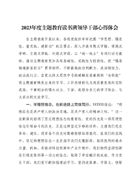 2023年度主题教育读书班领导干部心得体会自主题教育开展以来,各级党组织牢牢把握学思想、强党性、重实践、建新功的总要求,深入开展专题式学悟、课题式学研、主题式学践、问题式学改,以到一线去专项行动为载体,推动主题教育更加具有基础性、实践性与创新性。把强基铸魂彰显担当贯穿始终,不断提高政治判断力、政治领悟力、政治执行力,自觉从伟大思想中寻找破解发展难题的金钥匙将主题教育焕发出来的学习、工作热情转化为高质量发展的实际成效、干事创业的强大动力。下面,我结合自己的学习体会,与大家共同交流学习。一、学理想信念,在前进路上笃信笃行。XXXXXX指出:理想信念是共产党人的政治灵魂,是共产党人的精神之钙。这一论断深刻指明了坚定理想信念的重要性。党的历史是一部用理想信念引领奋斗的历史。正是这种坚定不移的信仰,支撑我们党在革命、建设、改革各个历史时期都能够取得胜利。在我们的实践中,坚定的理想信念一直是指导我们克服困难、取得胜利的根本力量。例如,在推动科技创新和产业升级中,我们始终坚持创新是引领发展的第一动力的信念,取得了举世瞩目的成就。作为党员干部,我们要不断加强理论学习,坚持读原著、学原文、悟原理;要在实际工作中贯彻理想信念,确保理论学习与实践相结合要通过开展主题教育活动、理论研讨会等形式,深化对理想信念的理解和认识,不断增强党员干部的政治认同和行动自觉。二、学为民情怀,在前进路上牢记使命。XXXXXX强调:人民立场是我们党的根本政治立场。这句话深刻阐释了为民服务的根本宗旨。我们的一切工作都是为了人民,一切从实际出发都是为了人民的利益。在我们的工作中,为民服务的宗旨始终是我们行动的指南。比如,在优化营商环境、提高民生福祉方面,我们始终坚持以人民为中心的发展思想,不断推进社会治理和公共服务的创新。作为党员干部,我们要不断增强为民服务的意识,把人民群众的利益摆在首位;要倾听人民群众的声音,及时响应人民群众的期待;要持续推动解决群众最关心、最直接、最现实的利益问题,确保党的群众路线在新时代得到充分体现。三、学干事之能,在前进路上艰苦斗争。XXXXXX指出:要增强忧患意识,做到居安思危,努力克服一切艰难险阻。这句话强调了党员干部要有过硬的本领和坚强的意志。历史证明,任何伟大的成就都是在不懈努力和艰苦奋斗中取得的。在我们的工作中,艰苦奋斗的精神一直是我们攻坚克难的强大动力。在深化改革、推进法治建设等方面,我们党员领导干部勇于担当、积极作为,不断开创工作的新局面。作为党员干部,我们要继续加强学习,提高解决复杂问题的能力;要在工作中锐意进取、开拓创新,不断提高自身的干事创业本领;要坚持问题导向,强化责任担当和廉洁意识,确保每一项任务都能落到实处,取得实效。同志们,让我们在XXX新时代中国特色社会主义思想的指引下坚持不懈地强化学习,不断提升为民情怀,加强作风建设,勇于担当,为实现党的历史使命和人民对美好生活的向往而不懈奋斗