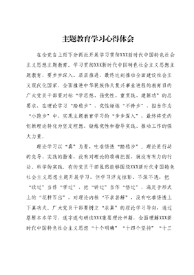 主题教育学习心得体会在全党自上而下分两批开展学习贯彻XXX新时代中国特色社会主义思想主题教育。学习贯彻XXX新时代中国特色社会主义思想主题教育,要步步深入、层层推进,最终达到推动全面建设社会主义现代化国家、全面推进中华民族伟大复兴事业进程的教育目的广大党员干部要对标学思想、强党性、重实践、建新功的总要求,在理论学习踏稳步、党性锤炼不停步、担当作为小跑步中,实现主题教育学习的步步深入,最终将党的创新理论转化为坚定理想、锤炼党性和指导实践、推动工作的强大力量。理论学习以真为要,吃准悟透踏稳步。理论是行动的先导、实践的指南,没有对理论的准确把握,就没有有力的行动、科学的实践。有的党员干部虽然能够围绕XXX新时代中国特色社会主义思想主题开展学习,但学习浮光掠影、不深不透,把读过当作学过,把讲过当作悟过,满足于形式上的花样百出,对理论内核不求甚解,没有吃准悟透上下真功夫。广大党员干部要树立求真的理论学习导向,通过原原本本学习、逐字逐句研读XXX重要理论书籍,全面理解XXX新时代中国特色社会主义思想十个明确十四个坚持十三个方面成就的主要内容,准确把握其基本观点、核心要义、科学体系、根本要求,在真学、真研、真懂、真通中,深刻感悟其思想伟力和实践伟力,不断增强贯彻落实的自觉性和坚定性。要结合大兴调查研究的工作要求,深入改革前沿、基层一线、群众中间,在走访调研、联系实际中,抓好理论消化、理解深化、学用转化,走稳走好主题教育真学真悟的第一步。党性锤炼以严为尺,检视整改不停步。主题教育既是提升党性修养的加油站,也是检视党性修养的放大镜是必须严格推进的政治大体检。有的党员干部习惯于对照红线找问题、对照底线查原因,检视整改做足形式、浮在面上,对工作信心是不是软、工作能力是不是弱、工作责任是不是虚、工作纪律是不是飘、工作机制是不是松缺乏深度查摆、严肃整改,没有发挥主题教育锤炼党性的戒尺作用。广大党员干部要坚持严的导向,紧抓主题教育契机,对照党的理论和路线方针政策、对照党章党规党纪、对照初心使命,再检视、再深化、再提升,推动主题教育整改融入日常工作、融入全面从严治党、融入班子队伍建设,确保教育整改全面扎实、反馈意见全面落实、实际效果全面提升。要自觉把主题教育节点作为干部四风的考点,不当无原则的老好人,不做不扛事的软肩膀,严于律己、严负其责、严管所辖,审慎稳妥处理好每件工作,确保不出纟比漏、不留瑕疵、不埋隐患,持续走好主题教育长管长严的每一步。担当作为以实为效,为民服务小跑步。主题教育好不好,归根结底要看成效扎实不扎实、群众满意不满意。有的党员干部错误地将总结汇报的句号当做主题教育的句点,将主题教育终结在交书面作业、报心得作文,在学以致用、学用相长上仍有欠缺,没有把学习理论与推进工作、整治问题、服务群众充分结合起来,导致学习没有成就感、百姓没有获得感。广大党员干部要树立以实绩论英雄的评价观坚持结果导向、问题导向,把开展主题教育同推动中心工作结合起来,对表对标党的XX大精神、XXX系列重要讲话精神,查缺补漏奋起直追,在破解难题中提质增效,在服务发展中担当作为。要牢记为民服务没有休止符,切实把党的创新理论这部厚重大书里的每一个字转化为为民服务的每一件事,用心用情用力解决群众急难愁盼问题,用辛苦指数换取群众幸福指数的提升,交出人民满意的合格答卷,在与人民群众的双向奔赴中,全力迈出主题教育人民至上的小跑步。