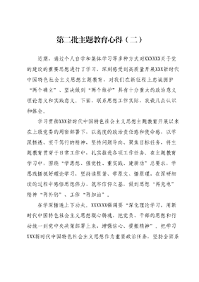 第二批主题教育心得(二)近期,通过个人自学和集体学习等多种方式对XXXXXX关于党的建设的重要思想进行了学习,深刻感受到高质量开展XXX新时代中国特色社会主义思想主题教育,对我们在新征程上忠诚拥护两个确立、坚决做到两个维护具有十分重大的政治意义理论意义和实践意义。下面,联系思想工作实际,我谈几点认识和体会。学习贯彻XXX新时代中国特色社会主义思想主题教育开展以来在上级党委的周密部署下,以高度的政治责任感和使命感,以学深悟透、实干笃行的精神,坚持问题导向、聚焦目标任务,将主题教育贯穿于日常工作中,扎实推进各项工作任务。在主题教育学习中,围绕学思想、强党性、重实践、建新功总要求,学思践悟抓好理论学习,坚持读原著、学原文、悟原理,在深研细读的过程中感悟思想伟力、筑牢信仰之基,做到思想再充电精神再补钙、工作再加油。在学深悟透上下功夫。XXXXXX强调要深化理论学习,用新时代中国特色社会主义思想凝心铸魂,把党员、干部的思想和行动统一到党中央决策部署上来,增强信心、提振精神。把学习XXX新时代中国特色社会主义思想作为重要政治任务,坚持全面系统、及时跟进学。一是要立足本职岗位、埋头做好本职工作的同时,尽可能意识地开阔自己的视野,为今后发展多打些基础、多做些准备;二是要处理好学习与理解、掌握与运用的关系,把学以致用作为学习的落脚点,在实践中学、在实践中用,真正把知识和能力转化为自己的眼界视野、思维方法、领导方式、工作措施;三是要有打破砂锅问到底的钻劲,养成经常总结反思的习惯善于在实践中学习、观察、思考、总结,探寻事物发展的内在规律,把握事物发展的大趋势,掌握推动工作的主动权。抓好调研解难题促发展。将深入一线、走入基层调查研究作为重要内容,是这次主题教育的一个鲜明特色。要强化责任意识当好求真务实的践行者,时刻以等不起、慢不得、坐不住的紧迫感,狠抓工作落实,善抓工作重点,做到手勤、脚勤和脑勤,将解决交通运输服务行业热点难点问题为出发点,做好基层调研。要把基层作为最好的课堂,把群众作为最好的老师,到群众中去,到困难大、矛盾多的地方去,与群众面对面交谈、用最朴实的语言访贫问苦、问计于民,真切感受群众的酸甜苦辣,要发现真问题、听到真心话。其次是摸实情。没有调研,就没有发言权。开展调研必须要结合基层实际,全方位全过程了解问题、解决问题,真正让调研成果为决策服务,让调研更有意义。最后是转作风。搞调研要转变作风、端正态度、改进方式、严明纪律,决不能为了调研而调研,更不能做表面调研要有俯下身子看清蚂蚁,蹲下身子解剖麻雀的态度做好调查研究加强检视整改树新风。要坚持问题导向和目标导向,对照党章党规党纪、对照法律法规,敢于自我揭短亮丑,做到见人见事见思想,真正触及灵魂、触及要害、触及痛处。要把原因分析透根源剖析准,既要总体分析面上情况,又要深入解剖麻雀剖析问题根源,要实实在在抓整改,要把整改工作纳入日常工作中经常查一查、看一看是否整改到位、是否出现反弹,是否发现新问题,要经常抓、抓经常,反复抓、抓反复,一时解决不了的,列出时间表,按期整改,做到问题不整改不罢休、整改不见效不罢手。XXX新时代中国特色社会主义思想主题教育是我们以后工作的方向和动力,作为服务部门,服务的提升是我们的宗旨,完成每一项服务是我们的目标,只有无止境的转型升级,才能提升自己才能更好的服务群众,要把深入学习贯彻XXX新时代中国特色社会主义思想作为主线,以更高标准、更严要求、更实措施,带头抓好理论学习,带头抓好调查研究,带头抓好问题检视和整改,认真抓好分管领域主题教育,党员干部作好示范表率,推动主题教育扎实开展、取得实效。