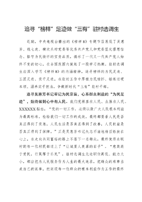 追寻榜样足迹做三有驻村选调生近期,中央电视台播出的《榜样8》专题节目展现了吴惠芳、钱七虎、横坎头村党委等优秀共产党人和党委坚定理想信念、恪守为民情怀的宝贵品质,揭示了一代又一代共产党人始终不变的初心,在全国范围内掀起了一股学习热潮。驻村选调生应深入学习《榜样8》的内涵精神,追寻榜样的为民足迹、工匠足迹、实干足迹,在驻村工作中厚植为民情怀、锤炼过硬本领、涵养实干担当,争做新时代三有驻村干部。追寻吴惠芳书记牢记为民宗旨,心系群众利益的为民足迹,始终做到心中有人民。我们党根基在人民、血脉在人民。XXXXXX指出,党的一切工作,必须以最广大人民根本利益为最高标准。检验我们一切工作的成效,最终都要看人民是否真正得到了实惠,人民生活是否真正得到了改善,人民权益是否真正得到了保障。正是吴惠芳书记矢志不渝地将百姓放在心上,在走向共同富裕的路上不落下一名群众,最终使得永联村的每一位村民都过上了让城里人羡慕的日子。意莫高于爱民,行莫厚于乐民,驻村选调生无论职位高低、能力大小,都应把为人民服务作为人生的最大追求,把群众的难事当成自己的家事,把实现每一位群众的根本利益作为工作的最终目标。多一些设身处地、换位思考,少一些自以为是、唯我独尊,真正把群众装在心里,把好事实事做到群众心坎上,诚心诚意为民解忧,全心全意为民谋福。追寻钱七虎教授勇攀科技高峰,引领国防工程的工匠足迹,始终做到手上有力量。在致首届大国工匠创新交流大会的贺信中,XXXXXX强调,要大力弘扬劳模精神、劳动精神、工匠精神,适应当今世界科技革命和产业变革的需要,勤学苦练、深入钻研,勇于创新、敢为人先,不断提高技术技能水平。工匠精神并不只局限于制造业,钱七虎教授深耕我国防护工程领域,凭借着科技界的工匠精神,促使我国防护工程各个时期的建设发展、科技水平跃居世界前列。驻村选调生要以工匠精神为指引,立足本职岗位诚实劳动,守为民服务的匠心,习为民服务的匠术,将自身理想信念与乡村振兴需要紧密结合,在如切如磋,如琢如磨中深入学习农业农村工作方法,刻苦充实乡村振兴的专业知识技能,不断锤炼自身过硬技术本领,提升打造和美乡村的创新创造能力,以手中坚实的力量助力宜居宜业和美乡村建设。追寻横坎头村党委坚持党建引领,守牢红色根脉的实干足迹,始终做到脚下有泥土。XXXXXX强调,我们需要的是立足于实际又胸怀长远目标的实干。横坎头村党委从组建大党委到推行锋领过坎工作法,从开展全域土地综合整治到成立红村互助平台,从联合周边村成立强村公司到打造旅游综合体,正是凭借着一步一个脚印地脚踏实地埋头干,横坎头村走出了一条红绿发展的致富之路。唯有实干,方能干实。驻村选调生也应时刻铭记共产党人空谈误国,实干兴邦之精神,把为人民谋幸福的初心落在行动上、把为民族谋复兴的使命担在肩膀上。要实事求是说实话,说群众能听懂的话;要从实际出发谋实事,真正了解人民需求,切实做好调查研究;要注重结果求实效,切实解决实际问题。始终谋在实处、干在实处,以实干摸清基层工作的路子,以实干固稳基层工作的步子。