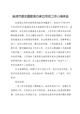 抽调市委主题教育办参加专项工作心得体会在集团公司和市国资委的信任和推荐下,我有幸于2023年9月至2024年2月抽调至市委主题教育办参与主题教育专项工作。抽调期间,我定岗在主题教育办综合组,工作内容主要涉及读书班跟班服务保障、有关文稿校对起草、内外沟通协调联动、资料信息传递报送及内部服务保障等。在主题教育办领导、同事带领支持下,我牢记使命任务,服从组织安排,工作兢兢业业,认真履职尽责,顺利圆满完成了各项工作,为全市主题教育工作高质量开展贡献了一份积极力量,展现了一名企业党员干部的责任担当和良好风貌,工作得到了省委第九巡回督导组和主题教育办领导和同事们的一致认可,本人被主题教育办表彰为先进个人,单位也被进行了通报表扬。时光转瞬即逝,回顾5个多月来的工作,有辛苦也有快乐,但更多的是收获和成长,总结起来有两处收获、三个提升、四点体会。两处收获:一是工作方面收获了履职能力。站在更高的平台,接触全市范围的工作,尤其是与全市不同系统、各条战线上优秀的同事共事,互相交流工作经验方法,让我既有在看待和处理问题时视野格局上的提升,也有在具体事务处理过程中甄别信息、理清思路对接沟通等综合能力的增长。二是生活方面收获了可靠友谊。抽调工作是一时的,但大家建立的友谊是长存的。无论是领导,还是同事,工作中体现的都是真性情和表里如一的作风,大家亦师亦友,做事不卑不亢,做人胸怀坦荡,围绕着高效完成全市主题教育工作的目标,起早贪黑,荣辱与共,紧张繁重的工作中不仅锻炼提升了大家的能力,也一起建立了深厚的友谊。三个提升:一是视野格局得到提升。参加工作以来,个人所见所思所想均只局限于企业内部、国资系统,工作更多是落实上级相关要求这次抽调参加专项工作,让我有机会学习从更广的视角纵向思考如何抓重点、促落实,也有机会看到各系统、各单位工作开展情况,学习典型做法和先进经验,从横向层面对比差距与不足。这次抽调参加专项工作的经历让我更加深刻理解体会到想问题、办事情应从大局出发,从全局思考,而不是固守自己的一亩三分地。二是工作标准得到提升。过硬的本领是工作高质量开展的关键。我所在的综合组和时常接触的材料组,较于集团公司行政部日常工作,面临更多急难繁重任务。唯有快速适应,方能游刃有余。这几个月,我看到了连夜赶稿、认真打磨、字斟句酌、千修万改、精益求精的工匠精神,看到了关键时刻不讲条件、不打折扣、勇挑重担的担当奉献精神……借鉴反思,更警醒我要把严谨、细致、规范要求贯穿到办文、办会、办事全过程,确保文经我手无差错,事经我办请放心。三是作风信念得到提升。莫道君行晚,更有晚归人。在主题教育办5+2白+黑是常态,领导带队坚守一线,一起熬过几个通宵达旦,好几位领导和同事劳累病倒,但始终不言放弃、带病上岗,同事们不顾得失、不讲条件、不畏艰辛、连续奋战,推动全市主题教育善始善终、有力有效。从这些领导、同事身上让我深切体会到越往上越需要召之即来、来之能战的铁兵,也深刻理解了作风过硬信念坚定的涵义所在。四点体会:一是勤学善思是成长进步的不二途径。学习不是打开书本圈圈画画做些笔记、打开学习强国听听看看凑个积分那么简单。学习是一个永恒的话题,是开阔眼界、转变思维、积累素材、提升能力、科学决策的重要法宝。在市委读书班跟班期间被领导们坚持学习的品质、博学多闻的才气和妙笔生花的能力所折服,在主题教育办同事们抽空都是登录网络干部学院学习,浏览主流媒体新闻信息,实时掌握最新理论动态,座谈交流发言出口成章,让我切实体会到了天外有天,人外有人,优秀的人比你更努力,也让我对学习的重要性和实用性认识更加深刻。二是团结奉献是干事创业的力量源泉。唯有团结才能凝聚力量、唯有奉献才能赢聚人心,团结是一种精神,奉献是一种境界团结奉献会提升工作质效,团结奉献能让我们打开格局,收获温暖。抽调人员来自各个系统,不同单位,大多之前都没参与过此类工作,专班成立即运行,人员抽调便投入,大家边工作、边适应、边熟悉,坚决服从指挥、严格执行命令、守护集体荣誉、甘于付出奉献,忙而有序渡过筹备阶段,顺利迎接中省重要调研,圆满完成收官任务,各项工作紧张有序,忙而不乱,且高质高效亮点频出,归结到一点就是所有人员能够做到团结奉献。三是认真负责是克难制胜的关键法宝。凡事最怕认真二字,工作全凭责任一词,只要认真负责,就没有解决不了的难题。有位领导曾教导我们说干工作凭的就是一份责任心,我不干现在这份工作,就是去贴个砖,我也能在行业里排个数一数二,我认同也始终相信,优秀的人在哪里都优秀。这次抽调参加工作,感触最大的就是同事们的优秀,每个人都能独当一面,安排的工作不打折扣,不讲条件,坚决服从,立即执行。大家身上最大的特点就是认真负责。无论是将要退休的老领导,还是刚参加工作没多久的小姑娘,大家都能知责于心