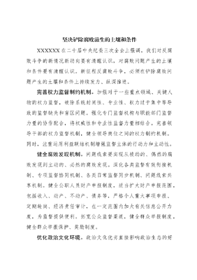 坚决铲除腐败滋生的土壤和条件XXXXXX在二十届中央纪委三次全会上强调,我们对反腐败斗争的新情况新动向要有清醒认识,对腐败问题产生的土壤和条件要有清醒认识。新征程反腐败斗争,必须在铲除腐败问题产生的土壤和条件上持续发力、纵深推进。完善权力监督制约机制。加强对于一些重点领域、关键人物的权力监督,破除系统封闭性、专业性、权力过于集中等导致的监督缺失和盲区问题。强化专门监督机构与职能部门监督力量的协作配合,将权威性和专业性监督力量相结合。完善领导干部的权力监督机制,健全领导岗位之间的权力制约机制。同时,注重运用利益联结机制增强监督主体的行动力和主动性。健全腐败发现机制。问题线索要实现从被动的、偶然的腐败发现到主动的、必然的腐败发现。深化各类监督有效衔接机制、专项监督协同机制、各类日常监督同步机制、问题线索共享机制。健全公职人员财产申报制度,适当扩大财产申报范围,包括收入、动产、不动产、债务等,严格个人重大事项申报、定期轮岗、经济责任审计,在一定范围内加大有关信息公开力度,为监督提供便利。拓宽公众监督渠道,健全群众举报制度,健全群众举报保护、奖励制度。优化政治文化环境。政治文化优劣直接影响政治生态的好坏。优化政治文化,构建良好的政治生态环境,是铲除腐败滋生的土壤和条件的重要方面。要抓好正风肃纪,坚持实事求是、唯实不唯上,立足对党负责、对人民负责、对事业发展负责。要强化担当作为,防止形式主义、官僚主义,时刻把党和人民利益放在心中。党员干部要强化斗争精神,提升斗争能力。切实把容错纠错机制建立好、运用好,发挥激励干部担当作为的作用,形成良好的政治氛围。以大数据反腐为契机,强化统筹协调、打破条块关系束缚大数据技术依托互联网、物联网、移动互联网等网络技术,在调查腐败、发现潜在腐败等方面发挥积极作用,增强反腐的力度和辐射力,有助于推动反腐全覆盖,推动不能腐的制度笼子更加牢固。为继续深入推进反腐败斗争,深化一体推进三不腐体制机制,有必要借助大数据反腐这一技术变革契机,完善反腐败工具箱,强化党内监督与各类监督协调贯通,从更高层面统筹协调大数据反腐,破除部门数据壁垒,打破条条块块之间的体制机制障碍,形成强大的反腐败合力,以反腐败工作的协调性,提高国家治理、地方治理的协调性,不断提高国家治理体系和治理能力现代化水平。文可居文库——海量学习资料,手机电脑均可下载www.wenkeju.com