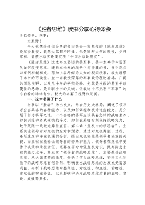 《胜者思维》读书分享心得体会各位领导、同事:大家好!今天我想给诸位分享的书目是金一南教授的《胜者思维》提起金教授,我想大家都不陌生,他是国防大学的教授,少将军衔,曾获出版界最高奖项中国出版政府奖。《胜者思维》这本书主要谈的是军事,是一本关于中国军队如何改变思维,进而在未来的战争中打得赢的书。书中观点与事例相辅相成,再加上各种鲜为人知的秘闻轶事,极大增强了本书的可读性。金一南教授深厚的军事政治理论基础,广阔的国际视野,以及几十年的研究经验,尤其是发散的甚至于颠覆性的思维,是串联全书的关键。让我这个不热衷军事的小白看的津津有味,极大的丰富了视野和见闻。一、这本书讲了什么全书以胜者为出发点,结合历史大格局,阐述了领导者应当具备的各种能力,以及如何掌握和提升这些能力。是介绍了何为将军之道,一个合格的将军应该具备怎样的战略素养,如何训练和养成硬核战斗力,如何在黑暗时刻保持战略定力,敢于跟随一线微光勇往直前。第二章危机中的领导者,主要关注领导者对危机的应对和预防,通过对危机类型、过程、蔓延速度和潜在机遇的分析,提出危机决策是领导者决策的关键,而且往往能验证领导者的格局和能力,领导者在危机中要勇于决策和承担责任,还要在平时增强危机意识,提高防患未然的能力水平。第三章领导者的战略思维,主要是讲战略思维,从大国博弈的角度,分析了何为战略思维,不同文化背景下的战略思维有何异同,明确提出战略思维的出发点是国家利益,分析了战略思维中整体性、对抗性、彻底性、前瞻性、进取性的突出特征,以及影响和决定战略思维质量的胆略、塑造、威慑等要素。二、从这本书中获得了什么这是一本针对领导者的书,更是传授我们每个人提升领导能力的书。对于我们普通人,这本书的道理并不遥远,至少可以通过破解胜者思维,掌握在竞争中胜出的三件法宝。法宝:一场危机的背后往往蕴藏着机遇。在危机中育新机于变局中开新局。在本书第二章的危机产生严重挑战,也带来重大机遇中提到了几个案例。日本的购岛闹剧,菲律宾在南海闹腾,表面上给中国制造小麻烦,实则为中国海军进驻这些区域,彻底解决领土争端提供了很好的契机,既让世界看到了中国对于领土问题的坚决态度,也从另一个侧面看出了中国这几年的强大。索马里的危机,这场危机的背后也蕴藏者机遇,中国海军得以在国际的支持下驶出东海、南海海域,去往亚丁湾执行护航任务,这既增加了中国的影响力,也为日后中国建立海外的基地提供了便利的条件,从目前的形势上看,中国建立海外基地是必要且合理的事情,护航编队的官兵们需要补给,需要上岸调整。可见索马里的危机为中国提供了多么难得的机会。之前的马航事故也是这样子,我知道我们都不愿看到这场事故的发生,但是不得不承认,因为这次马航的意外,为中国建立南海的机场提供了理由你看,全世界的搜救队在南海搜索了那么久都没找到,可见在南海修建机场,在意外发生的时候可以第一时间进行搜救,还可以为各国的搜救队提供服务,使其更好的执行搜救任务,这是中国作为负责任的大国所义不容辞的职责。从上述的案例可以很明显地看出,危机背后都会蕴藏者机遇,它可能是另一个国家发展的机遇,可能是为未来某场突发事件的应急处理做出了示范,当以后同类事件发生时可以更加有效规避风险,或者减轻损失。这些道理在生活中同样适用,古人云:祸兮福之所倚,福兮祸之所伏!可见连古人都很清楚这其中的道理,福祸相依,文可居文库——海量学习资料,手机电脑均可下载www.wenkeju.com在一定条件下还可以相互转化。这也给我们很大的启发,作为一种处世的哲学,帮助我们更好地生活,当灾难、危机发生时,不要一味地难过,自责。想想其背后蕴藏的机遇,用你智慧的大脑去发现。这些关于转化的智慧,接受的智慧,只要我们善于从中学习,定能受益匪浅。所以当下次有不好的事情发生时,试着问问自己,能不能换个角度看待,并且提醒自己,哦,或许,这是件好事也说不定呢,更有甚者是,今天看起来是坏事,但十年之后再去回望,说不定就又变成好事了。危机背后往往蕴藏者机遇,遇事学会换个角度看问题,再比如说美国处处制约中国发展,干涉中国的正常活动,这是件坏事,但我们要庆幸,正因为有了美国这样一个强大的对手,我们才能有这么快的发展,我们才不会放松危机意识,才不会像过去的清王朝那样陷入盲目自大的心态之中,有这么一个对手,这反而是一件好事。危机产生严重的挑战,也带来重大的机遇。作为领导者,不仅要有居安思危的意识,更应该具备应对危机、化危机为转机的能力。面对危机,优秀的领导者需必备两大要素:第一,即便在最黑暗的时候,也具有能够发现一线微光的慧眼;第二,敢于跟随着一线微光前进。能够发现微光,依靠的是智慧,根据当前信息,分析局势,做出正确决策。敢于跟随微光前进,则是积极面对危机的勇气,朝着切实可行的目标,尽可能的在短时间内制定预案、