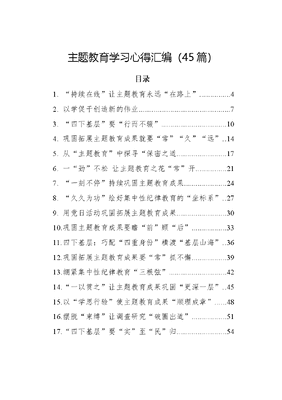 主题教育学习心得汇编(45篇)目录1.持续在线让主题教育永远在路上.42.以学促干创造新的伟业73.四下基层要行而不辍.104.巩固拓展主题教育成果就要常久远..145.从主题教育中探寻保密之道..176.一劲不松 让主题教育之花常开.217.一刻不停持续巩固主题教育成果.248.久久为功绘好集中性纪律教育的坐标系..279.用党日活动巩固拓展主题教育成果..3010.巩固主题教育成果要瞻前顾后3311.四下基层:巧配四重身份横渡基层山海..3612.巩固拓展主题教育成果要常抓不懈3913.绷紧集中性纪律教育三根弦4214.一以贯之让主题教育成果巩固更深一层..4515.以学思行验使主题教育成果顺理成章4816.摆脱束缚让调查研究破圈出道5117.四下基层要实至民归..5418.以真材实料让主题教育成果余味悠长5719.久久为功确保主题教育为民之风绵绵不绝6020.秉怀四心 书写主题教育之延绵.6321.巩固拓展主题教育成果当久久为功6622.巩固拓展主题教育成果要以初心致未来.6923.常字当头巩固主题教育成果持续在线7124.做足精细活让调查研究扎实有效..7425.巩固拓展主题教育成果要点线面结合..7726.四下基层:巧拆四字锦囊揭开零字谜底..8027.念好四下基层零字诀.8328.时刻叩问让主题教育余音不绝8629.四下基层需从零开始.8930.在稳舵扬帆定锚中巩固主题教育成果..9231.借一方诗意 让主题教育意味隽永9532.以低头抬头回头之态巩固拓展主题教育成果..9833.做足精细活让主题教育成果持续巩固.10134.增添四味让主题党日更有质效10335.学思想重在学悟行融合.10736.善用望闻问切 谱写巩固拓展新篇章10937.以学促干让主题教育成果事上见112文可居文库——海量学习资料,手机电脑均可下载www.wenkeju.com38.巩固拓展主题教育成果要平衡好三组关系.11439.矢志落实四学长效机制11740.做《平语近人》里的现代化青年..12041.巩固拓展主题教育成果要严抓不松.12342.烹一盏茶香让主题教育味浓香永12643.四下基层:上下兼顾勾勒效字轮廓13044.汲取心力让主题教育常开成果之花..133添柴点火让主题教育成果持续发热135文可居文库——海量学习资料,手机电脑均可下载www.wenkeju.com持续在线让主题教育永远在路上中共中央办公厅印发《关于巩固拓展学习贯彻XXX新时代中国特色社会主义思想主题教育成果的意见》,强调建立健全以学铸魂、以学增智、以学正风、以学促干的长效机制。广大党员干部要从中汲取实践经验,化作奋进力量,坚持追求真理,始终饱含真情,敢于碰硬动真格,让理论学习、四下基层、自我革命持续在线,确保主题教育永远在路上。理论学习持续在线,永葆天下至德