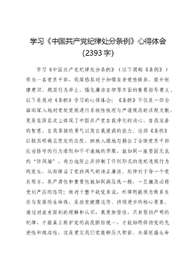 学习《中国共产党纪律处分条例》心得体会(2393字)学习《中国共产党纪律处分条例》(以下简称《条例》)作为一名党员干部,我深感其对于加强自身党性修养、提升纪律意识、规范行为举止、强化廉洁自律等方面的重要指导意义。以下是我对《条例》学习的心得体会:《条例》不仅是一部全面而深入地对党纪党规进行系统性梳理与严谨规范的法规文献,更是在深层次上体现了中国共产党自我净化的决心、自我完善的智慧、自我革新的勇气以及自我提高的能力。这部《条例》以极其明确且坚定的态度,细致入微地勾勒出了全体党员干部应当恪守的行为准则和不可逾越的界限,就如同一座坚固无比的防风墙,有力地防止并抑制了任何形式的违纪违规行为的发生,从而保证了党内风气的清正廉洁。纪律对于每一个党员而言,其严肃性和重要性就如同高压线一般,一旦触及必将受到严厉的惩罚;而对于整个政党来说,纪律则被视为维系生存与发展的生命线,是政党健康运作、持续进步的核心要素。通过对此有深刻的理解和认识,我更加坚信,只有坚持严明的纪律,才能真正维护党的高度团结统一,才能始终保持党的先进性和纯洁性,这是奠定我们党能够历久弥新、永葆旺盛生命力和强大战斗力的基石所在。唯有如此,我们的党才能够在面对各种挑战时,始终坚守初心,勇往直前,不断从胜利走向新的胜利。一、强化宗旨意识,保持政治定力。通过深入研读并理解《条例》的精神内涵,我深深体会到作为一名党员干部所肩负的重大责任与使命,更加坚定了内心对于全心全意为人民服务这一根本宗旨的认识。我深知,我们党员干部的根本立场就是人民立场,我们的力量源泉在于人民群众,因此,必须时刻保持与人民群众的紧密联系,这种联系就如同血与肉一样不可分割,深植于我们的工作和生活中。在实际的工作实践中,我们要将服务人民的理念贯彻到每一个环节,坚决走好党的群众路线,这是我们的行动指南和工作基石。这意味着我们必须亲力亲为,深入基层,深入了解群众的需求和疾苦,用心倾听他们的声音,切实关注并解决他们在生活、工作中遇到的实际困难。同时,我们要勇于创新,不断改进群众工作的方式方法,避免因形式主义、官僚主义而造成的疏离感和隔阂,真正实现与群众的面对面、心贴心的交流与互动。秉持着能力为先、执行为要、效能为王的原则,我们在提升自身综合素质和服务水平的同时,更要注重提高工作效率和质量,以实实在在的工作成效来回应人民的期待。面对实际问题,我们要有敢于担当、文可居文库——海量学习资料,手机电脑均可下载www.wenkeju.com善于作为的决心和勇气,不仅要发现问题,更要解决问题,确保每一件关乎民生福祉的事情都能得到及时有效的处理,真正做到为人民排忧解难,办实事,办好事,让人民群众共享改革发展的成果,不断提升他们的幸福感和安全感。二、坚持自我检查,做到知行合一。《条例》犹如一面明亮的镜子,不仅为我们在日常行为与工作中提供了深度自查自纠的重要参照依据,更是敦促每一位党员以党章党规为准绳,严肃且全面地审视自身的言行举止,深入挖掘并剖析潜在的问题和不足之处。它强调了勇于面对错误、坚决改正过失的精神风貌,无论大小过错,都应当秉持着有错必改,有过必纠的原则,时刻保持警醒,持续提升和完善自我。在深入研习《条例》的过程中,我全身心投入,细致入微地逐章逐段解读其内涵要义,力图透彻理解每一项条款背后的深远意义,努力熟记每一条文的具体内容,让它们深深烙印在心中。我坚信,这样的学习并非仅仅停留在理论层面,而是要将其内化于心、外化于行,切实地将学习的过程转变为一种强化纪律意识、推动自我革新、实现自我完善的实际行动。通过这段系统而深入的学习,我深刻领悟到,遵守党的纪律并不是一种消极被动的束缚或限制,而是一种积极主动的自我要求和修炼。对于每一名党员干部而言,严守党纪不仅是必备的政治素养,更是体现文可居文库——海量学习资料,手机电脑均可下载www.wenkeju.com个人高尚道德情操和坚定理想信念的重要标志,是我们作为共产党员应有的基本品质和精神自觉。只有这样,我们才能真正履行好党和人民赋予我们的职责使命,永葆共产党人的先进性和纯洁性。三、坚守廉洁底线,维护纪律权威。《条例》以其严谨详尽的规定,明确划定了廉洁从政的行为边界,犹如一道不可逾越的红线,旨在警示我们每一位党员干部,必须始终保持清醒的头脑和坚定的决心,时时刻刻做到自我约束、严于律己,坚决杜绝任何形式的腐败行为,积极防御并防止其滋生蔓延。在日常工作的各个环节中,我将不折不扣地执行中央制定的八项规定以及相关的实施细则精神,以最高标准严格要求自己,对于任何可能影响公正执行公务、损害党和人民利益的诱惑,我都将毫不犹豫地坚决抵制,坚守党纪国法的底线,稳固构筑起廉洁自律的坚固防线。同时,为了深化对廉政建设重要性的认识,我将主动参与各类警示教育活动,通过对典型违纪违法