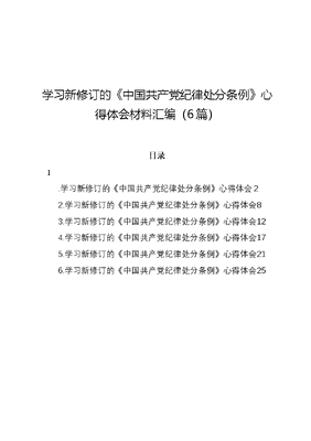 学习新修订的《中国共产党纪律处分条例》心得体会材料汇编(6篇)目录1.学习新修订的《中国共产党纪律处分条例》心得体会22.学习新修订的《中国共产党纪律处分条例》心得体会83.学习新修订的《中国共产党纪律处分条例》心得体会124.学习新修订的《中国共产党纪律处分条例》心得体会175.学习新修订的《中国共产党纪律处分条例》心得体会216.学习新修订的《中国共产党纪律处分条例》心得体会25学习新修订的《中国共产党纪律处分条例》心得体会《中国共产党纪律处分条例》(以下简称《条例》)是认定违纪、对违纪党员和党组织作出党的纪律处理的根本法规,是党的纪律处分工作的基本依据,是维护党的纪律的有力武器,是每个党组织和党员都必须遵守的行为规范。我们作为中央和国家机关党员干部,是贯彻落实党中央决策部署的第一方阵,必须在严格执行《条例》和维护党的纪律上走在前列、当好表率。一、常态学习检视念好纪律规矩紧箍咒党的十八大以来,党中央三次修订《条例》,始终坚持严的基调,不断完善纪律规矩,释放了从严治党越来越严、越往后执纪越严的强烈信号,充分彰显了我们党推进自我革命的坚定决心和坚强意志。贯彻执行《条例》,首先要学好《条例》,切实把纪律要求内化于心、外化于行。要深刻领会新修订《条例》的重要意义。学习贯彻《条例》是促进全党更加深刻领悟两个确立的决定性意义、坚决做到两个维护的必然要求,是贯彻落实XXX新时代中国特色社会主义思想的具体行动,是用严明的纪律管党治党的现文可居文库——海量学习资料,手机电脑均可下载www.wenkeju.com实需要,是总结从严管党治党经验、实现制度与时俱进的实践要求。《条例》有利于推动全党在新征程上统一思想、统一意志、统一行动,步调一致向前进,为新征程上一刻不停推进全面从严治党提供坚强纪律保障,使铁的纪律真正转化为党员干部的日常习惯和自觉遵循,充分发挥纪律建设标本兼治的利器作用,推动全面从严治党向纵深发展。我们要深入学习领会,切实把思想和行动统一到党中央决策部署上来,自觉学好《条例》、用好《条例》。要准确把握新修订《条例》的主旨要义。新修订《条例》对违反政治纪律行为的处分共28条,比2018年版《条例》增加2条外加2款,进一步严明政治纪律和政治规矩,带动各项纪律全面从严。加强全方位管理和经常性监督,责任上全链条,管理上全周期,对象上全覆盖,使管党治党的思路举措更加科学严密有效,让铁纪长牙、发威。坚持实事求是,把从严管理监督和鼓励担当作为统一起来,有针对性地作出纪律规范,引导激励党员干部敢于担当、积极作为。一体推进锤炼党性、纯洁党风、严明党纪,持续放大标本兼治的综合效能,保持共产党人的先进性和纯洁性。我们要潜心学习,把《条例》为什么修订、改了哪些地方、修订背后的深意等搞明白,把自己摆进去、把工作摆进去、把职责摆进去,对照检视自己的差距不文可居文库——海量学习资料,手机电脑均可下载www.wenkeju.com足在哪里,从而强化自我约束,提高免疫能力,做到知敬畏、存戒惧、守底线,保持高昂的干事创业精气神。要认真学习新修订《条例》的条款内容。新修订的《条例》分为总则、分则、附则,共11章158条。与2018年版《条例》相比,新增16条,修改76条。我们要把《条例》作为常修课必修课,常态化逐章逐条学习,把党的纪律规矩是什么,能干什么、不能干什么搞清楚,印刻在脑海里,做到学习跟进、认识跟进、行动跟进。要把学习贯彻《条例》与学习贯彻XXXXXX关于全面从严治党、加强纪律建设的重要论述结合起来,与学习党的十八大以来管党治党理论、实践和制度创新成果结合起来,与学习党章党规结合起来,增强贯彻执行的自觉性和坚定性,紧密联系个人思想、生活、工作等实际融会贯通学习,切实把学习的过程变成进一步强化纪律意识、规范自身言行的过程。二、自觉慎独慎微系好人生前行安全带纪律的约束力取决于纪律的执行力。纪律不彰,必然失去防线;规矩不严,必然警示无力。贯彻执行《条例》,就是要从细微之处严起,慎独慎微,防微杜渐,筑牢纪律规矩的防火墙,安全走好人生每一步。要守好小事小节。古人云,勿以恶小而为之,勿以善小文可居文库——海量学习资料,手机电脑均可下载www.wenkeju.com而不为。以违反廉洁纪律行为案件为例,许多沦为阶下囚的党员干部,在反省自己一步步走向堕落的过程中,反思基本都是从思想上的小毛小病、经济上的小偷小摸、生活上的小贪小占开始的,都是从一个土特产、一张购物卡、一桌饭菜、一条香烟开始的。这些问题如温水煮青蛙一样,一步步地让你放松了警惕,进而心存侥幸、私欲膨胀,等到最后不可自拔,最终滑入罪恶深渊。生活小事不能等闲视之,更不可麻木不仁。要从戒第一次贪念、拒第一次诱惑、抵第一次腐蚀做起,坚决不破底线、不踩红