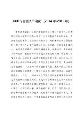 XXX论全面从严治党 (2014年-2015年)需要注意的是,不能把党组织等同于领导干部个人,对党尽忠不是对领导干部个人尽忠,党内不能搞人身依附关系。干部都是党的干部,不是哪个人的家臣。有的干部信奉拉帮结派的圈子文化,整天琢磨拉关系、找门路,分析某某是谁的人,某某是谁提拔的,该同谁搞搞关系、套套近乎,看看能抱上谁的大腿。有的领导干部喜欢当家长式的人物,希望别人都唯命是从,认为对自己百依百顺的就是好干部,而对别人、对群众怎么样可以不闻不问,弄得党内生活很不正常。邓小平同志早就说过:上级对下级不能颐指气使,尤其不能让下级办违反党章国法的事情;下级也不应当对上级阿谀奉承,无原则地服从,尽忠。不应当把上下级之间的关系搞成毛泽东同志多次批评过的猫鼠关系,搞成旧社会那种君臣父子关系或帮派关系。党内决不能搞封建依附那一套,决不能搞小山头、小圈子、小团伙那一套,决不能搞门客、门宦、门附那一套,搞这种东西总有一天会出事!有的案件一查处就是一串人,拔出萝卜带出泥,其中一个重要原因就是形成了事实上的人身依附关系。在党内,所有党员都应该平等相待,都应该平等享有一切应该享有的权利、履行一切应该履行的义务。XXX:《严明党的组织纪律,增强组织纪律性》(2014年1月14日),选自《十八大以来重要文献选编》(上),中央文献出版社,2014年9月版党是我们各项事业的领导核心,古人讲的六合同风,九州共贯,在当代中国,没有党的领导,这个是做不到的。中央委员会,中央政治局,中央政治局常委会,这是党的领导决策核心。党中央作出的决策部署,党的组织、宣传、统战、政法等部门要贯彻落实,人大、政府、政协、法院、检察院的党组织要贯彻落实,事业单位、人民团体等的党组织也要贯彻落实,党组织要发挥作用。各方面党组织应该对党委负责、向党委报告工作。有的同志习惯于把分管工作当成自己的禁脔,觉得既然分管就没有必要报告了,也不希望其他人来过问,有的甚至不愿意党委过问,不然就是党政不分了。这种想法是不正确的。党委是起领导核心作用的,各方面都应该自觉向党委报文可居文库——海量学习资料,手机电脑均可下载www.wenkeju.com告重大工作和重大情况,在党委统一领导下尽心尽力做好自身职责范围内的工作。报告一下有好处,集思广益,群策群力,事情能办得更好。各地区各部门党委(党组)要加强向党中央报告工作,这也是一个规矩。XXX:《严明党的组织纪律,增强组织纪律性》(2014年1月14日),选自《十八大以来重要文献选编》(上),中央文献出版社,2014年9月版党要管党、从严治党,靠什么管,凭什么治?就要靠严明纪律。一九六四年十月,周恩来同志在音乐舞蹈史诗《东方红》演出人员大会上作报告时说,毛泽东同志说我们党是一个有纪律的,有马克思列宁主义的理论武装的,采取自我批评方法的,联系人民群众的党,毛泽东同志特别把有纪律放在最前面,这不是偶然的。因为这是决定党能否坚持革命、战胜敌人、争取胜利的首要条件。干部出问题,都是因为纪律的突破。必须严明党的纪律,党的各项纪律都要严。遵守党的纪律是无条件的,要说到做到,有纪必执,有违必查,而不能文可居文库——海量学习资料,手机电脑均可下载www.wenkeju.com合意的就执行,不合意的就不执行,不能把纪律作为一个软约束或是束之高阁的一纸空文。XXX:《严明党的组织纪律,增强组织纪律性》(2014年1月14日),选自《十八大以来重要文献选编》(上),中央文献出版社,2014年9月版改革开放和发展社会主义市场经济,改变了原有的资源配置方式和组织管理模式,越来越多的单位人变成社会人,各种复杂的人际关系和利益关系对党内生活带来不可低估的影响,引发了种种问题,组织观念薄弱、组织涣散就是其中一个需要严肃对待的问题。比如,有的个人主义、自由主义严重,目无组织纪律,跟组织讨价还价,不服从组织安排;有的党组织和领导干部在处理一些应该由中央和上级组织统一决定的重要问题时,事前不请示、事后不报告,搞先斩后奏、边斩边奏,甚至斩而不奏;有的变着法儿把一件完整的需要汇报的大事情分解成一件一件可以不汇报的小事项,让组织程序空转;有的领导班子既有民主不够、个人说了算问题,也有集中不够问题,文可居文库——海量学习资料,手机电脑均可下载www.wenkeju.com班子里各自为政,把分管领域当成私人领地,互不买账,互不服气,内耗严重;有的只对领导个人负责而不对组织负责,把上下级关系搞成人身依附关系;有的办事不靠组织而靠熟人、靠关系,形形色色的关系网越织越密,方方面面的潜规则越用越灵;有的党组织对党员、干部疏于管理,缺乏严肃认真的组织生活,等等。组织纪律松弛已经成为党的一大忧患。组织观念、组织程序、组织纪律都要严起来。不严起来,就是一盘散沙。X