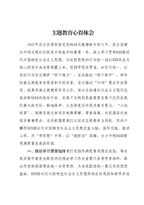 主题教育心得体会2023年是全面贯彻落实党的XX大精神的开局之年,是全面建设中国式现代化国家开局起步的重要一年,深入学习贯彻XXX新时代中国特色社会主义思想,切实把思想和行动统一到以XXX同志为核心的党中央决策部署上来,坚持学思用贯通、知信行统一,以实际行动坚定拥护两个确立、坚决做到两个维护,牢牢把握主题教育总要求和目标任务,全力推动3458重点任务落实,统筹开展主题教育各项工作。面对全面建设社会主义现代化美丽新XXXX的使命任务,发展不足特别是高质量发展不足仍是我们最大的实际,耕地保护、生态修复还有很多难关要过,六权改革、创新发展还有很多难题要解,要素保障、为民服务还有很多难事要办。这些都需要我们以这次主题教育为契机,坚持不懈用XXX新时代中国特色社会主义思想武装头脑、指导实践、推动工作,用学思想开局、以建新功落脚,全力开创XXXX管理高质量发展新局面。一、理论学习贯穿始终我们党始终高度重视理论武装,每次党内集中教育也都坚持把理论学习作为首要任务并贯穿始终,都会用党的创新理论统一全党思想,为全党团结统一奠定坚实思想基础。XXX新时代中国特色社会主义思想深刻总结我国和世界其他国家现代化建设的历史经验,进一步深化了对中国式现代化的内涵和本质的认识,概括形成中国式现代化的中国特色、本质要求和重大原则。为我们准确把握中国式现代化的根本性质、牢牢锚定中国式现代化的奋斗目标、充分激发推进中国式现代化的强劲动力指明了前进方向。深入学习贯彻XXX新时代中国特色社会主义思想,为我们深刻把握新时代新征程上风险挑战的新特征新变化不断深化对风险演进的规律性认识,战胜各种风险挑战提供了科学指引。同时也为我们在纷繁复杂的形势下把准团结奋斗的正确方向,不断增强以团结奋斗开辟美好未来的志气、骨气、底气,不断开创资源管理事业高质量发展新局面提供了根本遵循。坚持理论学习六学,重点学习必学篇、跟进学习最新篇、系统学习XXXX篇、持续学习生态篇、专题学习资源篇贯通学习改革篇。原原本本、逐字逐句掌握XXXXXX关于耕地保护、要素保障、生态保护修复等XXXX工作最新重要论述。深学细悟把握XXX新时代中国特色社会主义思想精髓,在政治品格、思想境界、斗争意志、作风操守上再发力、再对照、再检查,切实筑牢信仰之基、补足精神之钙、把稳思想之舵。推动理论学习往深里走、往实里走、往心里走。二、学用结合指导实践党的十八大以来,以XXX同志为核心的党中央从中华民族永续发展的高度出发,深刻把握生态文明建设在新时代中国特色社会主义事业中的重要地位和战略意义,创造性提出一系列新理念新思想新战略,充分体现了党对生态文明建设重要性的认识,明确了生态文明建设在党和国家事业发展全局中的重要地位。把学习贯彻党的XX大精神和XXXXXX视察XXXX重要讲话指示批示精神摆到突出位置,坚持学用结合、以学促干,以主题教育五个载体为抓手,与局系统主题教育实施方案中确定三项改革四项重点五项整治八件实事十项调研工作重点相结合对标看齐行动,对照检视整改,针对XXXXXX亲自安排部署的大棚房清理整治、违建别墅问题清查整治、农村乱占耕地建房等重大专项整治行动和黄河流域生态环境警示片披露突出问题整改工作,仔细查找短板弱项,认真整改有关问题,深入开展XXXX领域乱点乱象整治,严厉震慑和打击各类违法违规行为,确保XXX说的,做到做好。坚持以点带面、举一反三抓好中央巡视、环保督察、国务院大督查、国家审计反馈等问题整改,针对全民所有XXXX资产所有权委托代理机制试点改革进展慢的问题,土地和矿业权审批程序中存在的漏洞缺陷等问题进行大排查大起底,建立台账、对账销号,一个问题一个问题解决,一个堡垒一个堡垒攻克,积小胜为大胜,切实把讲政治的要求体现在具体行动上落实到实际工作中,确保党中央部署的,落实落细。三、坚定担当促进发展要学深悟透为什么建设生态文明、建设什么样的生态文明怎样建设生态文明等重大理论和实践问题。在建设社会主义现代化美丽新XXXX的征程中,要深入思考如何把XXX生态文明思想贯穿始终,站在人与自然和谐共生的高度谋划生态保护修复工作。要反复学习领会XXXXXX关于像保护大熊猫一样保护耕地绿水青山就是金山银山中国人的饭碗牢牢端在自己手中等重要论述,始终心怀国之大者,切实担当XXXX系统严守资源安全底线、优化国土空间格局、促进绿色低碳发展、维护资源资产权益的职责使命。围绕局系统主题教育实施方案中确定345810一体推进、贯通落实。坚持以人民为中心的发展思想在主题教育中重点把事关人民群众切身利益的事情抓紧抓牢、抓实抓细。聚焦国有土地上已出售并入住城镇住宅办证难问题积极推进房屋产权证书依法依规办理。聚焦地质灾害防治问题,开