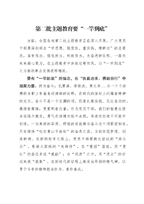 第二批主题教育要一竿到底当前,全国各地第二批主题教育正在深入开展。广大党员干部要深刻领会学思想、强党性、重实践、建新功的总要求,葆有信念、强化担当、积极作为,为奋进新征程、一路向未来凝心聚力,在主题教育中淬炼过硬作风,以一竿到底之力推动事业发展提质增效。要有一竿到底的信念,在执着追求、勇毅前行中凝聚力量。何为奋斗,孔繁森、廖俊波、黄文秀在一个个拼搏的身影上有着生动清晰的诠释,在时代的坐标上闪耀着精神的光芒。奋斗不是一个空洞的词,而是扎根实践、无比生动的,激扬着豪情,更蓄积着力量。作为党员干部,我们的智慧在投身实践中激发,勇气在拼搏向前中点燃,奇迹在打破不可能中创造,一切美好的品质、辉煌的成就都与奋斗这个词紧密相连,只有保持咬定青山不放松的奋进之姿,方能实现梦想、创造新绩。在新的赶考之路上,党员干部要做大胆试的排头兵,要做大胆闯的先锋将,在重担面前,用勇扛的姿态来说我能;在风浪之中,用进击的行动来说我敢,在新时代新征程上焕发出昂扬的精气神,以勇于斗争的精神担当作为、善作善成。要有一竿到底的担当,在下沉到底、倾情奉献中办好实事。为人民造福是我们不懈奋斗的目标。因此,在实践中,党员干部要用这一价值标尺来校准自己的言行,衡量自己的作风优不优、做得好不好、业绩实不实。为民服务得有满腔热情,要多下基层、多入村户、多坐板凳、多问群众,下要下到底,入要不漏户,坐要面对面,问要问清楚,只有望闻问切才能为群众的需求精准把脉。为民服务得有吃苦精神,需要跑腿的就要奔走到底,需要送炭的就要马不停蹄,强化坐不住、等不得的强烈责任感,以无私奉献、埋头苦干的精神为群众纾难解困,只有不辞辛苦、不怕麻烦,才能把事情办进群众的心坎里,让服务成效真正经得起人民群众的检验。要有一竿到底的热劲,在脚踏实地、狠抓落实中强化作风。假努力干不出真业绩,只有实打实地做,才能有实实在在的成效。征途漫漫,党员干部要沉下心去干,要一步一个脚印追逐梦想,在为民服务上不舍点滴之功,把求真务实、精益求精贯穿到工作的全过程,对问题深剖细研,在实践中积累经验,多向人民群众求教,以务实的作风实现工作的优化、本领的提升,以勇于担当、主动作为把使命扛牢。在推动事业发展的进程中,党员干部要有钉钉子精神,锚定目标不松懈,逐一攻克有韧劲,主动发现问题、及时解决问题,用真招式、金点子突破关卡,在难点和堵点上持续发力,保持狠抓落实、久久为功的恒心,把工作做实,把为民服务的举措落细,让工作多开花结硕果。