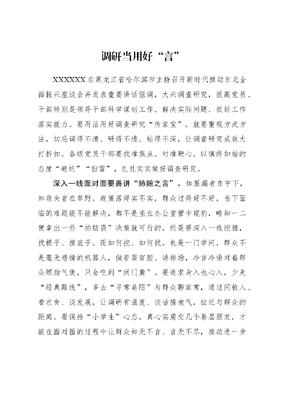 调研当用好言XXXXXX在黑龙江省哈尔滨市主持召开新时代推动东北全面振兴座谈会并发表重要讲话强调,大兴调查研究,提高党员、干部特别是领导干部科学谋划工作、解决实际问题、抓好工作落实能力。要用活用好调查研究传家宝,就要重视方式方法,切忌调得不清、研得不透、钻得不深,让调查研究成效大打折扣。各级党员干部要找准焦点、对准靶心,以慎终如始的态度避坑扫雷,扎扎实实做好调查研究。深入一线面对面要善讲肺腑之言。知屋漏者在宇下,知政失者在草野。政策落得实不实,群众过得好不好,当下面临的难题能不能解决,都不是坐在办公室管中窥豹,略知一二便拿出一些拍脑袋决策就可行的,而是要深入一线挖掘,找根子、摸底子。而如何挖、如何找,也是一门学问,群众不是毫无感情的机器人,倘若耍官腔、讲排场,冷言冷语对着群众颐指气使,只会吃到闭门羹。要追求身入也心入,少走经典路线,多去寻常巷陌与群众聊家常,通过问收入、看衣食、谈发展,让调研有温度、谈话接地气,拉近与群众的距离。要保持小学生心态,真心实意交几个基层朋友,才能在面对面的过程中让群众知无不言、言无不尽,推动进一步找准问题、摸清情况。撰写报告实打实应坚持言必有据。调研报告是对一次调查研究的提炼总结,其形要简,其势要清,要准确反映面临的问题和矛盾,条分缕析把原因讲清楚、举措讲明白。不能为了博关注显成绩,净挑好的说,净拣亮点讲。要本着实事求是的态度,摆脱别人没说过的不敢说、别人没提过的不敢提的顾虑,着眼于调研过程中了解到的新经验、新问题,大胆立论,深入浅出,用群众语言说明观点。要立足局部看全局,胸怀全局论局部,把搜集到的材料集中透视,逐一过筛子,运用马克思主义的立场观点方法,去粗取精、去伪存真,留下干货提升报告质量。同时,形成初稿后,要积极组织调研主体和被调研对象共商共议,有不足讲不足,使报告形成一个严密的、合乎逻辑的整体,增强感染力和真实性。成效评估好不好由群众畅所欲言。成效评估,关键在真,核心在实。调研成效如何,不应由党员干部自说自话,而是要敞开大门让群众当考官,才能让调研的成果得到准确评价。要抓紧抓实问题整改这个关键环节,杜绝层层发包、以文件落实文件,主动邀请群众参与进来,多提提意见、找找不足,同向发力,对照群众愿望清单,逐一销号落实,让整改更加科学客观。调研结束之后,要通过民主评议、群众代表会议等方式广泛征集群众意见,对群众有疑问的结果,要及时查核,做好解释说明,对群众不认可的成果,要针对具体工作全面复盘,检验环节是否有遗漏,落实是否真到位,自查自纠,做到群众不点头不收手,以抓铁有痕、踏石留印的干事状态,交出一份经得起实践和历史检验的答卷。
