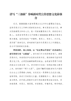 谱写三部曲奏响新时代宣传思想文化最强音近日,XXXXXX对宣传思想文化工作作出重要指示指出,宣传思想文化工作事关党的前途命运,事关国家长治久安,事关民族凝聚力和向心力,是一项极端重要的工作。新的赶考之路上,各级宣传思想文化干部要以XXXXXX重要指示精神为根本遵循,自觉承担起举旗帜、聚民心、育新人、兴文化、展形象使命任务,奏响新时代宣传传思想文化工作最强音,奋力书写新的时代答卷。高扬旗帜,凝心铸魂,以咬定青山不放松的赤诚初心谱写思想引领主题曲。宣传部门作为党的喉舌部门,凝聚思想共识,传递党的声音是根本职责所在。做好新时代宣传思想文化工作,必须坚持旗帜鲜明讲政治,各级宣传思想干部要把政治方向摆在第一位,把思想和行动统一到党的XX大精神上来,始终胸怀两个大局,坚持不懈用XXX新时代中国特色社会主义思想凝心铸魂,切实把这一思想转化为武装头脑、指导实践、推动工作的强大力量。把握围绕中心、服务大局的基本职责,把开展主题教育与学习党的最新理论结合起来,坚持读原著、学原文、悟原理,学深悟透、学懂弄通,常学常新、活学活用。同时,要树牢底线思维,时刻绷紧意识形态这根弦,在意识形态领域敢于斗争、善于斗争,坚决守好各类宣传思想阵地,不断巩固马克思主义在意识形态领域的指导地位,不断凝聚全党全国人民团结奋斗的共同思想基础。与时俱进,守正创新,以君子之学必日新的坚定信心谱写宣传造势交响曲。知常明变者赢,守正创新者进。时代在不断进步发展,宣传思想文化工作也要与时俱进、守正创新。作为党的宣传工作者,必须主动适应新时代的形式变化,紧紧跟随新兴技术的发展趋势,始终坚持思维创新、内容创新、形式创新、手段创新,以群众喜闻乐见、通俗易懂的形式开展理论宣传宣讲,推动党的创新理论飞入寻常百姓家,各级宣传思想文化干部要紧扣我是谁、为了谁、依靠谁这一重大命题,坚持受众在哪里,宣传报道的触角就要伸向哪里,当好民生传声筒,架好群众连心桥,搭好网上网下同心圆。同时,要紧扣时代脉搏,把故事讲出味,把新闻做出彩,把有意义的事讲得有意思,奏响新时代宣传工作最强音。以文化人、培根铸魂,以文化铸魂润无声的坚强决心谱写文化传承奏鸣曲。XXXXXX曾指出:文化是一个国家、一个民族的灵魂。文化兴则国运兴,文化强则民族强。当前,世界百年未有之大变局加速演进,有文化自信的民族,才能立得住、站得稳、行得远。新时代以来,人民群众对精神文化需求不断增长,各级宣传思想文化干部要始终坚持以人民为中心的工作导向,以高质量文化供给增强群众的文化获得感、幸福感,不断满足人民对美好精神文化生活的新期待,用新形式、新表达、新体验让文化活起来、火起来,让文物热、博物馆热点燃群众的心中奇梦。同时,要坚定深沉的文化自信、保持高度的文化自觉、担当起新的文化使命,积极传承和弘扬中华优秀传统文化,推动中华优秀传统文化创造性转化、创新性发展,不断铸就中华文化新辉煌,为建设文化强国贡献力量。
