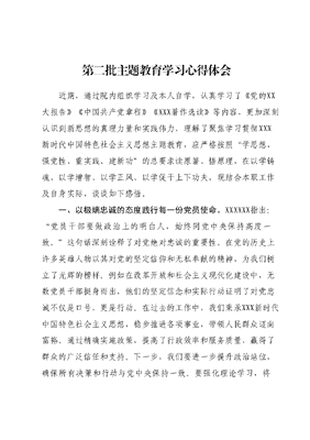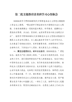 第二批主题教育读书班学习心得体会XXXXXX在学习贯彻XXX新时代中国特色社会主义思想主题教育工作会议上强调,要全面学习领会新时代中国特色社会主义思想,全面系统掌握这一思想的基本观点、科学体系,把握好这一思想的世界观、方法论,坚持好、运用好贯穿其中的立场观点方法。按照学习贯彻XXX新时代中国特色社会主义思想主题教育专题民主生活会有关要求,本人通过集体学习和个人自学等方式,在次重温了党的XX大报告、党章等重要内容,对新思想有了更加全面的认识。下面结合个人实际,跟大家谈几点心得体会。一、要坚定理想信念,树牢宗旨意识。XXXXXX指出:理想信念,就是共产党人精神上的钙。这句话令我深受启发。在过去的工作中,我们要始终保持共产党人的理想信念,坚定不移走中国特色社会主义道路。比如,我们市在抓经济建设的同时,始终把为人民服务作为根本宗旨,先后投资数十亿用于改善民生,让老百姓真正获益。这体现了我们坚定理想信念,始终把人民放在心中最高位置。下一步,我们要进一步加强党的建设,用XXX新时代中国特色社会主义思想武装头脑,筑牢信念之基;要严格要求党员干部心中装着人民,一切为了人民,始终牢记为人民服务的根本宗旨;要坚持正确政治方向,在思想上政治上行动上与以XXX同志为核心的党中央保持高度一致。二、要加强理论武装,筑牢思想之基。XXXXXX指出:理论武装整个党,理论武装广大干部特别是领导干部,是我们党的一项战略任务。这句话令我们深受教育。在过去的工作中,我们坚持把学习贯彻XXX新时代中国特色社会主义思想作为首要政治任务,不断推动全市党员干部提高政治判断力、政治领悟力、政治执行力。比如,我们先后组织了多场专题理论学习研讨班,还开设了线上理论学习平台,形成了学习教育常态化长效化机制,让广大党员干部受到充分理论武装。下一步,我们要持之以恒加强理论学习,把学习成果转化为推动各项事业发展的实际行动;要把学习XXX新时代中国特色社会主义思想作为头等大事,不断强化理论自觉,坚持学思用贯通确保各项工作落实落地;要广泛开展我为群众办实事实践活动,不断增强全体党员干部为人民服务的本领。三、要埋头实干苦干,再创佳绩佳效。XXXXXX指出:干部就是要干事,就是要担当作为。这句话深深鞭策我们。在过去的工作中,我们不断弘扬实干作风,勇于担当作为,为全市改革发展稳定作出应有贡献。比如,我们紧紧围绕年度目标任务,超额完成了上级下达的各项经济社会发展指标,得到了上级的表扬和肯定。下一步,我们要继续发扬作风建设永远在路上的精神,狠抓工作落实,以责任心和使命感统筹各项工作,确保各项任务落到实处;要殚精竭虑为企业发展解难题,让市场主体充分感受到党和政府的支持;要深入基层一线听取民声,努力办好民生实事,让人民群众获得更多实惠。四、要聚焦合格标准,树立良好形象。XXXXXX指出:党员干部就是党的窗口,就是党的名片。这句话警醒我们要时刻注意个人品行。在过去的工作中,我们严格要求全体党员干部遵守党纪国法,坚决反对特权思想和特权现象,努力树立党员干部良好形象。比如,我们先后开展领导干部德操教育,严肃处理个别违纪违法案件,通过典型案例警示教育,确保党员干部队伍风清气正。下一步,我们要进一步弘扬艰苦奋斗、勤政为民、公道正派的优良作风,做人民群众的贴心人、可靠人和良师益友;要坚持从严治党,持之以恒正风肃纪,严肃查处腐败问题,营造风清气正的政治生态;要强化党员干部的宗旨意识、规矩意识和道德意识,筑牢不敢腐、不能腐、不想腐的思想防线。