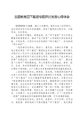 主题教育四下基层专题研讨发言心得体会XXXXXX在福建、厦门工作期间,曾两次深入到军营村、白交祠村访贫问苦和考察调研,体现了强烈的为民导向、问题导向、务实导向。我们要牢记嘱托、感恩奋进,把四下基层作为开展主题教育的重要抓手,推动四下基层工作制度在同安落地生根、开花结果,以实际行动坚定拥护两个确立、坚决做到两个维护。一是坚持为民导向,践初心、惠民生。为群众办实事、为地方谋发展是四下基层制度的出发点和落脚点。我们要大力践行以人民为中心的发展思想,坚持在发展中保障和改善民生,注重发挥党员干部示范带头作用,持续深化我为群众办实事实践活动,总结用好跨村联建、三个一线、服务基层大篷车等机制做法,用心用情用力抓好就业、教育、医疗、住房、养老等领域民生大事,下大力气解决好信访诉求、处理好矛盾纠纷,让广大群众共享富美新同安高质量发展成果。二是坚持问题导向,解难题、促发展。问题是时代的声音也是工作的导向。我们要发扬担当精神和斗争精神,把传承践行四下基层与大兴调查研究紧密结合起来,与落实全区抓党建促综合改革紧密结合起来,围绕推进工业经济高质量发展、农业农村现代化等重点调研课题,进一步健全领导干部常态化现场办公、走访调研和镇(街)吹哨、部门报到等机制,用改革思维、创新办法,着力破解产业发展、项目建设、乡村振兴、社会治理等领域重难点问题,以一把钥匙开一把锁的精准务实举措破解发展新问题、打开发展新局面。三是坚持务实导向,转作风、抓落实。实干兴邦,实字当头,最直接、最有效的工作路径就是四下基层。我们要坚持把四下基层作为抓落实的重要手段,把群众满意不满意作为检验工作成效的根本评判标准,深入开展基层组织提升年干部作风提升年活动,按照两化三单要求,以钉钉子精神一件一件抓落实、不断争优争先争效,推动干部作风更优、服务群众更实、干群关系更密切,确保党的路线、方针、政策在基层有力贯彻落实,凝聚起建设富美新同安的强大合力,为全市努力率先实现社会主义现代化作出同安贡献。
