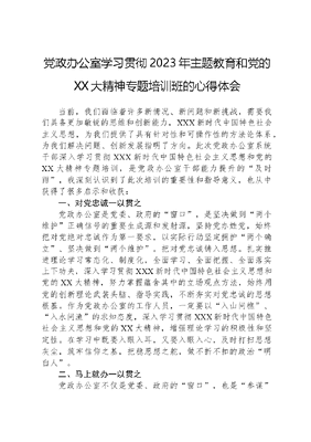 党政办公室学习贯彻2023年主题教育和党的XX大精神专题培训班的心得体会当前,我们面临着许多新情况、新问题和新挑战,需要我们具备更加敏锐的思维和创新能力,XXX新时代中国特色社会主义思想,为我们提供了具有针对性和可操作性的方法论体系,为我们解决问题、创新发展指明了方向。此次党政办公室系统干部深入学习贯彻XXX新时代中国特色社会主义思想和党的XX大精神专题培训,是党政办公室干部能力提升的及时雨,我深刻认识到了此次培训的重要性和指导意义,也从中获得了很多启示和收获:一、对党忠诚一以贯之党政办公室是党委、政府的窗口,是坚决做到两个维护正确信号的重要生成源和发射源,坚持党办姓党,始终把对党绝对忠诚作为第一要求,以实际行动坚定拥护两个确立、坚决做到两个维护。把对党忠诚铸入思想。扎实推进理论学习常态化、制度化,全面学习、全面把握、全面落实上下功夫,深入学习贯彻XXX新时代中国特色社会主义思想和党的XX大精神,努力掌握蕴含其中的立场观点方法,始终用党的创新理论武装头脑、指导实践,不断夯实对党忠诚的思想根基。作为党政办公室的工作人员,一定要以入山问樵、入水问渔的求知态度,深入学习贯彻XXX新时代中国特色社会主义思想和党的XX大精神,增强理论学习的积极性和坚定性。在学习中既要入眼入耳,又要入眼入心,及时打扫思想灰尘,筑牢信仰之基,把稳思想之舵,做不折不扣的政治明白人。二、马上就办一以贯之党政办公室不仅是党委、政府的窗口,也是参谋助手,要做到参之有道、谋之有方,就要紧跟X州委、政府,X县委、政府思路,紧扣发展全局、紧贴群众需求,扑下身子实干、雷厉风行快干,持之以恒抓落实。一是以文辅政促落实。坚持及早谋划,下好先手棋,树牢精品意识,弘扬短、实、新的文风,把党中央、省州县的大思路、大战略、大目标转化为符合X乡实际的具体抓手,增强文稿前瞻性、针对性、指导性,为重大决策部署的落实提供强有力的保障。二是调查研究促落实。开展全链条决策参谋服务,深入实际、深入基层、深入群众,大兴调查研究,拿出更多创新思路、务实举措,努力为X乡发展多提金点子、多出大主意。三是信息服务促落实。强化政治导向,优化信息质量,聚焦中心工作持续拓宽信息渠道,为促进X乡各项工作落实提供全面、准确、及时的信息。三、严谨认真一以贯之坚持办文、办会、办事一丝不苟、严谨细致、精益求精,真正做到于细微之处见精神、细节之间显水平,展现党办人优质服务、追求卓越的质量意识。一是坚持严要求办文。狠抓文件精细化审核,将纰漏、失误、意外消灭于萌芽状态,实现了高效率、零差错。二是坚持高标准办活动。着力精简各项会议活动,提高会务服务质量,慎之又慎办好各类会议,确保会议取得实效。三是坚持强规范运转。严格遵守保密各项规章制度,筑牢广大干部职工保密思想防线。加强行政后勤管理,健全公车使用、公务接待等各项规章制度和工作规范,推进节约型机关建设。强化档案业务指导监督,积极推进互联网+政务服务,优化政务服务事项,档案服务保障能力持续提升。四、下步工作计划持续深入学习贯彻XXX新时代中国特色社会主义思想和党的XX大精神,学以致用,提高办文、办会、办事能力。在工作中牢固树立一盘棋的思想,在想问题、干工作时自觉与党中央、省州县重大决策对标对表,把工作放在大局中思考、定为、摆布,做到正确认识大局,自觉服从大局,坚决维护大局。发挥老黄牛精神,常流苦干的汗水,做到躺着想事、坐着议事、站着干事,敢啃硬骨头、争当主攻手,进一步提高政治能力、提升政策水平、增强专业素养、强化创新意识,坚决当好坚强前哨和巩固后院,努力推进新时代三服务事业高质量发展,以强烈的责任感和使命感为X乡经济社会高质量发展作出新的更大贡献。