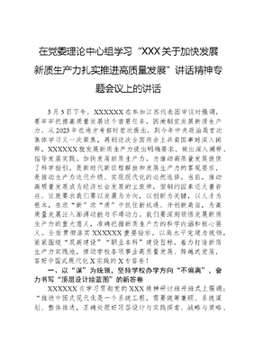 在党委理论中心组学习XXX关于加快发展新质生产力扎实推进高质量发展讲话精神专题会议上的讲话3月5日下午,XXXXXX在参加江苏代表团审议时强调,要牢牢把握高质量发展这个首要任务,因地制宜发展新质生产力。从2023年在地方考察时首次提出,到今年中央政治局首次集体学习又一次聚焦,再到这次全国两会上共商国事时深入阐释,XXXXXX就发展新质生产力提出明确要求、做出深入阐释、指导发展实践。加快发展新质生产力,为推动高质量发展提供了科学指引,是新时代新征程解放和发展生产力的客观要求,是推动生产力迭代升级、实现现代化的必然选择。当前,推动高质量发展成为经济社会发展的主旋律,但制约因素还大量存在。这就要求我们要以发展为方向,以创新为关键,以人才为根本,在求新求质中抓住新机遇、开创新局面,为高质量发展注入澎湃动能与不竭动力。我们要深刻领悟发展新质生产力的重大意义,准确把握新质生产力的科学内涵和核心要义。全面贯彻落实XXXXXX重要指示,以高水平党建为统领,紧紧围绕双高建设职业本科建设目标,着力打造新质生产力实践地,推动学校各项事业高质量发展、跨越式发展,答好中国式现代化X实践的X专答卷!一、以谋为统领,坚持学校办学方向不偏离,奋力书写顶层设计绘蓝图的新答卷XXXXXX在学习贯彻党的XXX精神研讨班开班式上强调:推进中国式现代化是一个系统工程,需要统筹兼顾、系统谋划、整体推进,正确处理好顶层设计与实践探索、战略与策略、守正与创新、效率与公平、活力与秩序、自立自强与对外开放等一系列重大关系。顶层设计与实践探索有机结合,既是一条重要经验,也是一种重要思维方法。顶层设计更注重系统思维和整体战略,为实践探索提供科学指引;实践探索则更注重创新思维和基层实践,为顶层设计提供实践基础。在现实中,只有把顶层设计与实践探索有机结合起来,才能有效推动工作。新一届X专领导集体注重顶层设计,鼓励实践探索。一是以科学的顶层设计推动学校高质量发展。顶层设计具有系统性、整体性、协同性、前瞻性等特征,强调从全局角度对相关各方面、各层次、各要素等进行统筹规划,为推动事业发展提供总体性的指导方案,目的在于协调各项工作,有力保障发展方向、目标、进度等。为深入贯彻落实XXXXXX对职业教育工作的重要指示批示精神,学校开展了以人才培养战略定位及专业结构优化调整和X护理高等专科学校十四五发展规划重点任务为主题的大讨论,在学校办学方向、办学理念、办学精神、办学定位、办学特色、发展战略、建设重点等方面形成了统一共识,绘制了学校高质量发展蓝图,推动学校向康养护特色鲜明的高水平技术技能型高等职业学校建设目标迈出新的更大步伐。二是以果敢的实践探索完善学校顶层设计。实践探索强调一切从实际出发,既不裹足不前,又不盲目冒进,在实践中摸索规律、获得真知、积累经验,寻求有效解决新矛盾新问题的方法路径。学校根据新时代职业教育发展方向和当前发展实际,对十四五发展规划重点任务进行了完善和修订,规划了十大工程和四十八项任务,作为今后一段时期学校推进高质量发展的重点工作。下一步,学校将聚焦重点精准发力,牢牢把握稳中求进以进促稳先立后破的工作总基调,通过扎实有力的实践探索,不断完善顶层设计,加快实现国内一流、国内知名、国际有影响的康养护特色鲜明的高水平技术技文可居文库——海量学习资料,手机电脑均可下载www.wenkeju.com能型高等职业学校建设目标。三是以绿色的校园文化打造新质生产力。XXXXXX指出,绿色发展是高质量发展的底色,新质生产力本身就是绿色生产力。对一所学校而言,打造风清气正的校园文化是XXXXXX两山理念的生动实践,就是绿色生产力、新质生产力。为推动高质量发展,打造新质生产力,学校确定把加强天使校园文化建设作为高质量发展的重要发力点。以绿色的校园文化为核心,更加注重以文化人、以文育人,广泛开展文明校园创建,积极开展健康向上、格调高雅的校园文化活动,策划组织形式多样、绿色低碳的社会实践活动,培养学生的创新意识和实践能力,塑造良好的品德和价值观念。同时,校园文化建设更要注重特色,通过挖掘学校的地域文化、学科特长和历史积淀,打造独特的校园文化,实现校园文化中的环境育人目标。要充分认识到,校园文化建设既是学校高质量发展的内在需求,也是促进新质生产力提升的重要手段。四是以奋进的领导集体提升新质生产力。对一所学校而言,一个团结奋进的领导集体是提升新质生产力的重要保障,就是绿色生产力、新质生产力。学校党委集体决策将康养护特色品牌打造与学校事业发展相结合,与服务国家战略、地方需求和学校改革发展相融合,牢牢把握发展新质生产力的重点任务、紧紧围绕推动高质量发展主线,聚焦中心服务大局,牢固树立和践行绿色发展理念,坚定不移走X专创新发展之路,就集