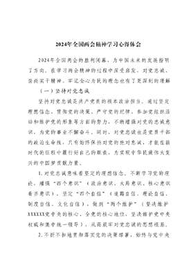 2024年全国两会精神学习心得体会2024年全国两会的胜利闭幕,为中国未来的发展指明了方向。在学习两会精神的过程中深受启发,对党忠诚、崇尚实干精神、牢记全心为民的理念也有了更深刻的理解(一)坚持对党忠诚坚持对党忠诚是共产党员的根本政治担当。通过坚定理想信念、贯彻党的决策、严守党的纪律、参加党组织活动和维护党的形象等方面的努力,不断增强对党的忠诚意识,为党的事业不懈奋斗。同时,对党忠诚也是党员干部的政治生命线,只有始终保持对党的绝对忠诚,才能在新时代的征程中履行好自己的职责,为实现中华民族伟大复兴的中国梦贡献力量。1.对党忠诚意味着坚定的理想信念。不断学习党的理论,增强四个意识(政治意识、大局意识、核心意识看齐意识),坚定四个自信(道路自信、理论自信、制度自信、文化自信),做到两个维护(坚决维护XXXXXX党中央的核心、全党的核心地位,坚决维护党中央权威和集中统一领导),从而筑牢对党忠诚的思想根基。2.不折不扣地贯彻落实党的决策部署,始终与党中央保持高度一致。积极响应党的号召,全身心投入到党的事业中。坚决执行党的路线方针政策,确保党的意志得到全面贯彻。3.严格遵守党的纪律和规矩是对党忠诚的必然要求。自觉接受党的监督和教育,不断提高自身的党性修养。通过参加党组织的学习和培训,增强纪律意识,做到知敬畏存戒惧、守底线。4.积极参加党组织的各项活动,是增强党组织凝聚力和战斗力的重要途径。通过与其他党员的交流与合作,共同推动党组织的发展,展现对党忠诚的实际行动。5.时刻保持政治敏锐性,坚决反对一切损害党的形象和利益的行为。时刻警惕敌对势力的渗透和干扰,勇于同一切违背党的原则和宗旨的行为作斗争,维护党的光辉形象。(二)崇尚实干精神崇尚实干精神就是要脚踏实地、敢于担当、善于调查研究、勇于创新、团结协作。只有这样,才能在工作中创造出经得起实践检验的业绩,为事业的发展贡献自己的力量。同时,实干精神也是一种工作态度和价值观,不仅能够提升个人的能力和素质,还能够营造良好的工作氛围,文可居文库——海量学习资料,手机电脑均可下载www.wenkeju.com促进团队的凝聚力和战斗力。在今后的工作中,我将实干精神贯穿始终,以实际行动推动事业发展。1.实干是成就事业的关键,正确的政绩观是通过踏实肯干、追求实际效果来体现的。只有真抓实干,才能取得实效,推动事业不断前进。2.以钉钉子的精神,坚定不移地抓好工作的落实,不推诿、不逃避,积极寻求解决问题的办法。面对问题和挑战要有勇气挺身而出,承担起自己的责任。3.深入基层,了解实际情况是做好工作的前提。通过实地调查和研究,可以获得真实的数据和信息,为科学决策提供可靠的依据。这样的决策才能够符合实际,更具针对性和可操作性。4.提高工作效率和质量,不断探索创新的工作方法。勇于尝试新思路、新技术,善于总结经验教训,将好的方法固化下来,不断优化工作流程,提升工作效果。5.团结协作是事业发展的重要保障。个人的力量是有限的,只有形成团队的合力,才能够更好地推动事业发展在工作中要强化沟通协作,互相支持、互相配合,共同为实现目标而努力。(三)牢记全心为民文可居文库——海量学习资料,手机电脑均可下载www.wenkeju.com牢记全心为民就是要始终以人民为中心,将人民的利益放在首位。通过密切联系群众、解决实际问题、促进公平正义、提高生活质量等方面的努力,实现人民的幸福和社会的进步。这需要我们在工作中不断强化服务意识提高为民服务的能力和水平,以实际行动践行人民至上的理念。同时,这也要求我们关注人民的需求变化,不断改进和完善工作,为人民创造更好的生活条件。只有这样,我们才能真正赢得人民群众的信任和支持,共同迈向更加美好的未来。1.要深刻认识到人民群众的力量是无穷的,始终将人民群众放在心中最高位置,全心全意做到为人民服务。2.密切联系群众,与群众保持紧密联系是为人民服务的基础。通过积极主动地与群众交流,倾听他们的意见和建议,我们可以更好地了解他们的需求和关注点,从而更有针对性地解决实际困难。3.投身民生工作,在改善民生、加强社会保障、推动教育医疗等领域的工作中积极贡献自己的力量。努力促进改革发展成果更公平地惠及全体人民,让每个人都能享受到发展带来的实惠。4.加强法治建设,确保人民群众的合法权益得到有效文可居文库——海量学习资料,手机电脑均可下载www.wenkeju.com保护,让人民在安全、公平的环境中生活和工作。5.人民对美好生活的向往是我们党员的奋斗目标。通过不懈努力不断满足人民群众对物质生活和精神生活的需求,提高人民的获得感、幸福感、安全感。通过对2024年全国两会精神的学习,我更加坚定了对党忠诚、崇尚实干、全心为民的信念。在今后的工作中,我将以两会精神为指引,努力提升自身素质和