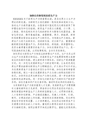 加快培育和发展新质生产力XXXXXX关于新质生产力的重要论述,是马克思主义生产力理论的新发展,为新时代全面把握新一轮科技革命突破方向,推动生产力高质量发展,全面推进中国式现代化建设提供了科学理论指导和行动指南。新质生产力是以大数据、云计算、人工智能、绿色低碳技术为代表的新技术与数智化机器设备、数智化劳动者、数字基础设施、海量数据、算力、新能源、新材料等新要素紧密结合的生产力新形态。与传统生产力相比,新质生产力是代表新技术、创造新价值、适应新产业、重塑新动能的新型高质量生产力,具有高科技、高效能、高质量特征,是符合高质量发展要求的生产力。加快发展新质生产力,是一项复杂的系统工程,必须统筹规划、全方位系统推进。加快形成与新质生产力相适应的新型生产关系。生产关系必须与生产力发展要求相适应,发展新质生产力也需要构建与其相适应的体制和机制。建立高标准市场体系,创新生产要素配置方式,进一步优化发展新质生产力的宏观环境,让各类先进优质生产要素能够向新质生产力顺畅流动。扩大高水平对外开放,为发展新质生产力营造良好国际合作环境。加快完善科研管理体制机制,建立一套以发展新质生产力为核心的科技创新评价体系,加快科技成果向新质生产力转化速度。进一步完善科技创新相关法律法规,进一步细化对新质生产力的知识产权保护条例,加快完善知识产权交易市场,推动科技成果的快速转化。为发展新质生产力提供重要人才支撑。发展新质生产力需要拥有大量较高科技文化素质、具备综合运用各类前沿技术能力、熟练掌握各种新型生产工具的新型数智人才。必须推动教育、人才培养和创新链、产业链深度融合,完善人才培养、引进、使用、合理流动的工作机制。根据科技发展新趋势,优化研究型高等学校学科设置、人才培养模式,加快形成与新质生产力发展需求相适应的人才结构。重视职业教育在培养专业技能人才方面的优势,使职业教育尽快适应数字化、智能化发展趋势,不断提高新质生产力所需的职业技术人才培养质量。强化发展新质生产力的科技支撑。科技创新能够催生新产业、新模式、新动能,是发展新质生产力的核心要素。加快发展新质生产力需要以前沿技术领域的颠覆式、突破式创新为前提,充分发挥我国社会主义制度集中力量办大事的优势,进行重大科技项目攻关,加快实现高水平科技自立自强,打好关键核心技术攻坚战,使原创性、颠覆性科技创新成果竞相涌现。推进产、学、研协同创新和融合发展。超前部署、全面开展前瞻性、先导性和探索性的前沿技术研究,大力支持产业应用研究,在重点产业和战略性新兴产业领域突破一批核心关键技术,形成一批具有自主知识产权和规模化应用前景的科技成果。积极引导创新要素向企业集聚,强化企业自主创新的意识和能力,强化科技创新对战略性新兴产业的驱动作用,推动更多科技成果转化为现实的新质生产力。加快培育发展数据要素市场。重视数据要素在生产活动中的地位,建立规范的数据要素管理体系。从法律层面明确界定数据要素的产权,尽快设立全国性的数据确权登记平台,明确数据产权界定的实施办法;尽快制定数据要素的价值评价体系,明确数据要素的可信度、共享性和实用性等方面的指标,以便更精准地进行数据要素的评估和交易。加快完善数据要素市场,激发数据要素的创造和流通。进一步加强数据开放共享,打破数据要素壁垒,使数据在流通中产生更大价值。持续监测和定期评估数据安全措施的有效性,并根据情况不断改进和加强数据安全策略。提升数字赋能新质生产力水平。加快形成新质生产力离不开数字技术的深度开发和广泛应用,为此,需要紧跟全球数字化发展趋势,加快推动数字产业化和产业数字化转型升级。一方面,加快数字产业化进程。推动数字技术创新成果的转化,进一步夯实大数据中心和数字基础设施建设,打造国际一流水平的数字产业集群。另一方面,着力推动传统产业数字化转型。促进文可居文库——海量学习资料,手机电脑均可下载www.wenkeju.com数字技术与实体经济深度融合,充分利用现代数字信息技术、先进互联网和人工智能技术对传统制造业进行全系统、全角度、全链条的改造,通过对研发设计、生产工艺、生产管理和销售服务等产业全链条、生产制造全过程的数字化和智能化改造,通过加快信息网络基础设施建设、搭建工业互联网平台和加强政策服务引导等系统工程,推进传统产业在决策、生产、运营环节上的数字化转型和智能化升级。夯实发展新质生产力的算力基础。算力是发展新质生产力的重要基础功能,只有全面提升算力水平,才能使大数据、人工智能等新技术顺利落地,才能使数据要素的价值得以充分发掘,才能使战略性新兴产业、未来产业得以快速发展。进一步加大芯片领域资金投入和支持,推动芯片制造先进工艺和设计能力的提升,推进芯片设计和制造技术创新,推进超级计算机研究和推广应用,加快提升打造高质量算力的硬件基础。加强国际交流与合作,吸收算法和软件领域国际先进经验