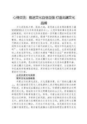 心得交流:推进文化自信自强 打造北疆文化品牌文化是民族之根、民族之魂,是民族生存发展的重要力量XXXXXX在文化传承发展座谈会上,从党和国家事业发展全局战略高度,对中华文化传承发展的一系列重大理论和现实问题作了全面系统深入的阐述,强调在新的起点上继续推动文化繁荣、建设文化强国、建设中华民族现代文明,是我们在新时代新的文化使命。要坚定文化自信、担当使命、奋发有为,共同努力创造属于我们这个时代的新文化,建设中华民族现代文明。内蒙古作为我国最早成立的民族自治区,在促进民族团结上具有光荣传统,长期以来拥有模范自治区的崇高荣誉。内蒙古理应在中华文化传承发展、建设中华民族现代文明方面勇于担当、奋发有为。打造北疆文化这一具有内蒙古特质的地域性文化品牌,是在新时代担负起新的文化使命的重要举措。打造北疆文化品牌,对铸牢中华民族共同体意识、全面推进中华民族共有精神家园建设、更好建设中华民族现代文明具有重要的时代价值。立足历史文化资源筑牢文化自信根基内蒙古历史源远流长,文化底蕴深厚。在广袤的北疆大地上,我们能够探寻到与人类起源和人类文明起源密切相关的鲜明踪迹。这里有旧石器遗址大窑文化,有熠熠生辉的亘古文明西辽河文化,有被称为中华文明曙光的红山文化,有青铜时代辉煌的鄂尔多斯青铜器文化,等等。内蒙古地区的历史文化呈现出灿烂辉煌、多彩纷呈的风貌。游牧与农耕经济在这里交流互补,游牧民族与农耕民族在这里交往互动,游牧文明与农耕文明在这里交汇融合。历史长河奔流不息,各民族在交往交流交融中情深意长,象征着民族融合与团结的昭君出塞等历史佳话在北疆大地上流传千年。新征程上,我们要强化责任担当,推进北疆文化建设。北疆文化是北疆区域内各民族在长期的交往交流交融中共同创造的,是中华文化的重要组成部分。北疆文化涵盖了内蒙古地区的所有文化,融红色文化和草原文化、农耕文化、黄河文化、长城文化等于一体,以各民族交往交流交融、守望相助、共同弘扬蒙古马精神和三北精神、铸牢中华民族共同体意识为基本内容。更好担负起新的文化使命,必须坚定文化自信。文化自信是更基础、更广泛、更深厚的自信,是一个国家、一个民族发展中最基本、最深沉、最持久的力量。XXXXXX指出:中国有坚定的道路自信、理论自信、制度自信,其本质是建立在5000多年文明传承基础上的文化自信。新征程上,我们要坚定文化自信,传承发展中华优秀传统文化,积极打造北疆文化品牌。立足北疆文化丰厚的历史文化资源,深入挖掘其丰富内涵及时代价值,彰显自信自强的精神力量。打造北疆文化品牌,要与时俱进、守正创新,激发北疆文化的创新创造活力,让北疆地区各民族创造的优秀文化在新时代绽放新光彩。同时,通过打造北疆文化品牌,深入挖掘其历史文化底蕴,推动拓展北疆文化品牌的影响力,让北疆地区各族人民从中体悟到文化的力量,筑牢文化自信根基。打造北疆文化品牌,推进文化自信自强,要着重从以下几方面入手。增强中华文化认同铸牢中华民族共同体意识铸牢中华民族共同体意识,这是内蒙古各项工作的纲我们推进文化建设要始终着眼于巩固中华民族共同体思想基础。打造北疆文化品牌,就要牢牢把握铸牢中华民族共同体意识这条主线。要坚持把马克思主义基本原理同中国具体实际相结合、同中华优秀传统文化相结合,推动马克思主义中国化时代化,守护好运用好马克思主义这个魂脉、中华优秀传统文化这个根脉,坚守中华文化立场,不断增强各民族对中华文化的认同。文可居文库——海量学习资料,手机电脑均可下载www.wenkeju.com北疆文化内容丰富,文化类型多样,特点鲜明,具有深厚的内涵与时代意蕴。要深入挖掘北疆文化资源中蕴含的中华文化元素,注重提炼展示中华文明的精神标识和文化精髓。要全面准确理解北疆文化与中华文化的关系,中华文化是主干,北疆文化是枝叶,北疆文化建设要在增强对中华文化认同的基础上来推进,正所谓根深干壮才能枝繁叶茂。加强宣传阐释系统梳理北疆历史文脉北疆文化内涵丰富,从不同角度可以归纳出不同的特征。北疆文化具有融合性、统一性、和平性、包容性、进取性等特征,与中华文明突出的连续性、创新性、统一性、包容性、和平性高度契合。北疆文化是典型的多民族融合文化。历史上,北疆地区一直是多民族聚居地,是各民族交往交流交融、各民族文化碰撞融合的广阔舞台。北疆文化以开放包容的态度对各类文化兼容并蓄、融会贯通,是在各民族交往交流交融、多元文化碰撞中传承发展起来的。北疆文化建立在对中华文化的高度认同上,在北疆大地,追求中华民族大一统始终是时代发展的主流。北疆文化奋力拼搏的进取性在吃苦耐劳、一往无前,不达目的绝不罢休的蒙古马精神和艰苦奋斗、无私奉献、锲而不舍、久久为功的三北精神中得到了充分体现。打造北疆文化品牌,要持续深入开展北疆文化研究工作,注重研究阐释、深入挖掘其丰富内涵和时
